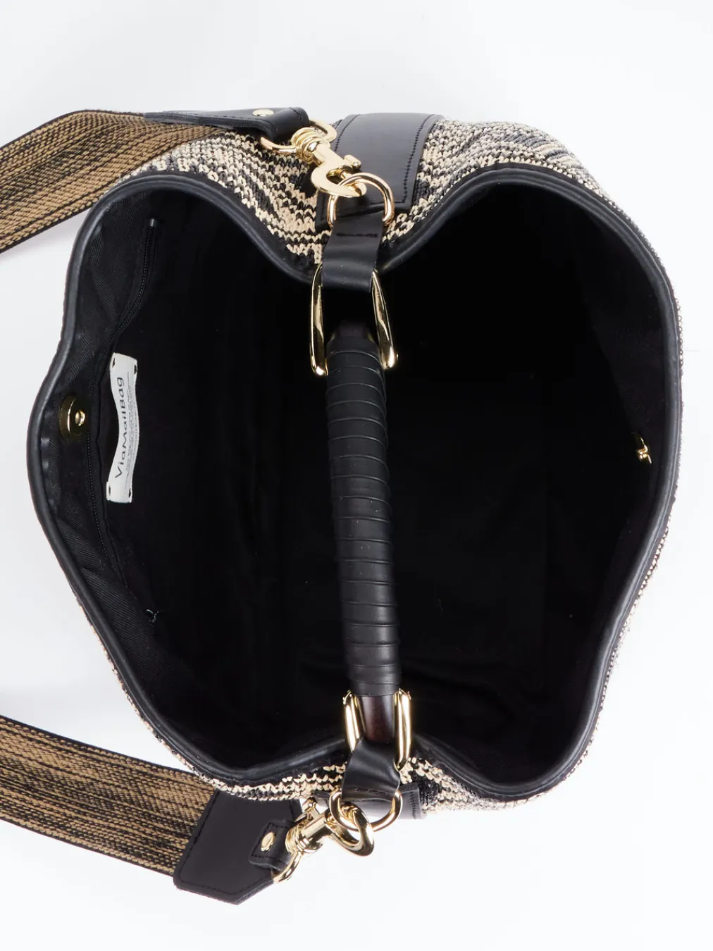 Ein echter Hingucker ist diese handgefertigte Schultertasche der italienischen Marke Viamailbag. Das schwarzweiße, hochwertige Textilmaterial zeigt sich in einem ausdruckstarken Ethnomuster. Dazu kommen schicke Akzente aus schwarzem Kalbleder. Der Innenraum bietet einen großzügigen Stauraum für Ihre Utensilien. Der modische, breite Schulterriemen kann bei Bedarf abgenommen werden. Dieses High Fashion Piece verleiht jedem Outfit eine ganz besondere Note! – Material: Textil – Farbe: Schwarz/ Weiß – Maße: ca. 24 x 34 x 14 cm (H x B x T) – Verschluss: Druckknopf – Schulterriemen: ca. 95 cm, abnehmbar – Innen: ein Hauptfach, ein Reißverschlussfach