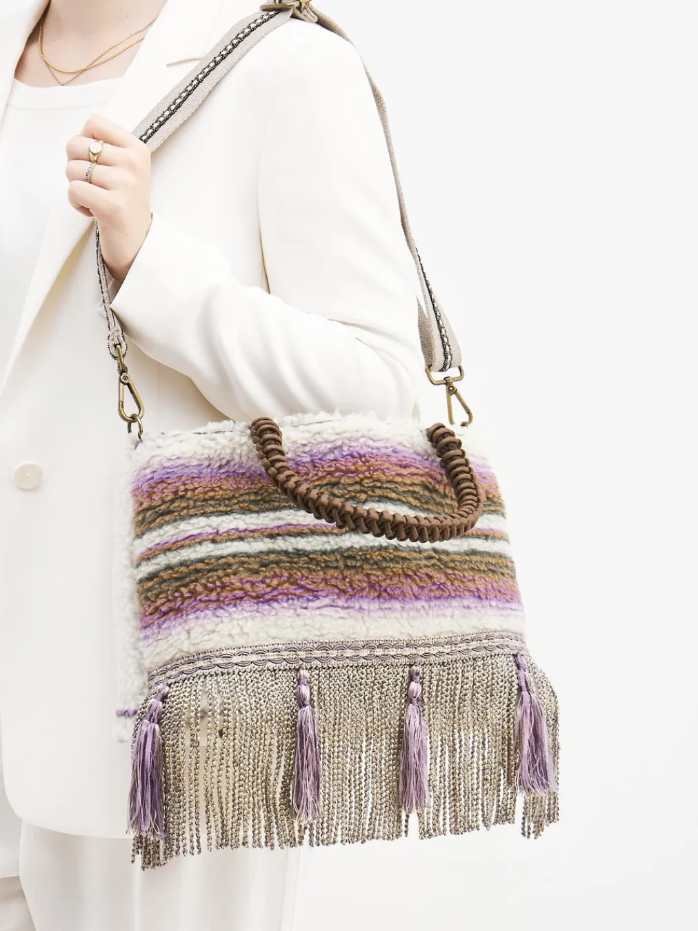Diese Schultertasche von Konstantin Starke interpretiert den Boho-Trend mit weicher Textur, gestreiftem Muster und kunstvoll gearbeiteten Details wie Fransen und goldfarbener Hardware auf moderne Weise.