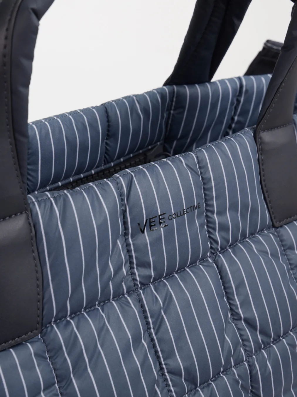 Gepolstertes Design für urbane Leichtigkeit. Die Marke VeeCollective Berlin präsentiert eine moderne Schultertasche in Shopper-Form mit gepolsterter Struktur und markanter Steppung. Ideal für Freizeit und Alltag bietet die aus robustem Nylon gefertigte Tasche eine angenehm leichte Haptik und hohe Strapazierfähigkeit. Der dunkelblaue Farbton wird durch ein dezentes Nadelstreifenmuster und tonale Ziernähte akzentuiert; ein mittiger Logo-Schriftzug setzt ein markentypisches Detail. Rechteckige Silhouette, Reißverschlussöffnung sowie Tragehenkel und ein verstellbarer Schulterriemen erhöhen den funktionalen Komfort. Stilistisch inspiriert von Streetwear und „Puffer Bag“-Trends, unterstreicht das Modell eine komfortaffine, urbane Ästhetik. Ein durchdachtes Accessoire mit Fokus auf Style, Funktion und Leichtigkeit.