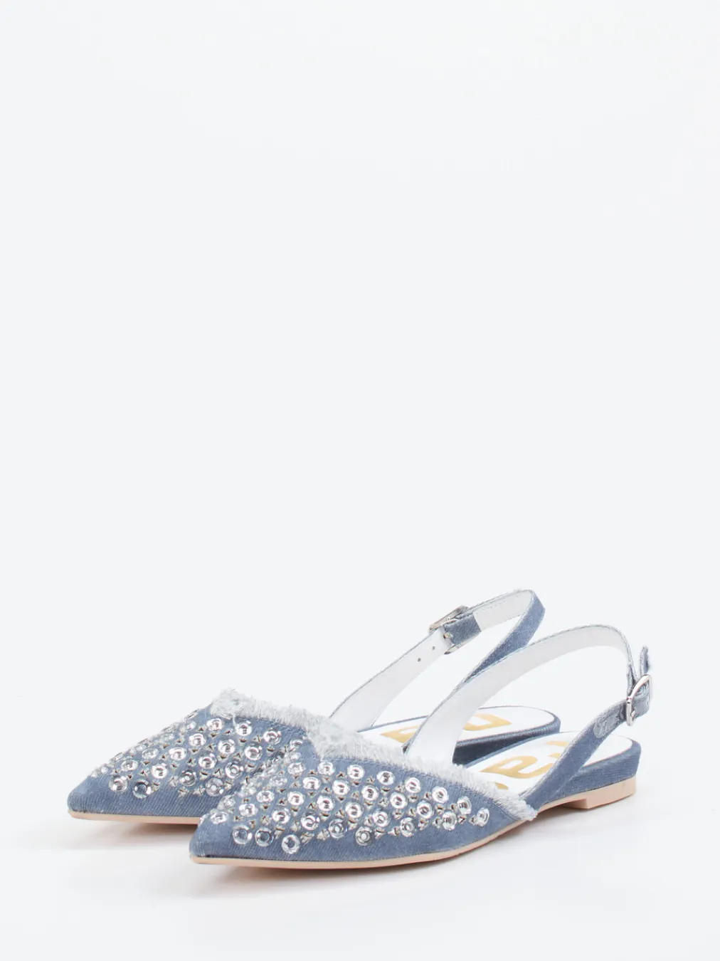 Y2K trifft Streetstyle: Die Slingback-Ballerinas von RAS kombinieren fransigen Denim mit glitzernden Strasssteinen zu einem modernen Look voller Ausdrucksstärke.