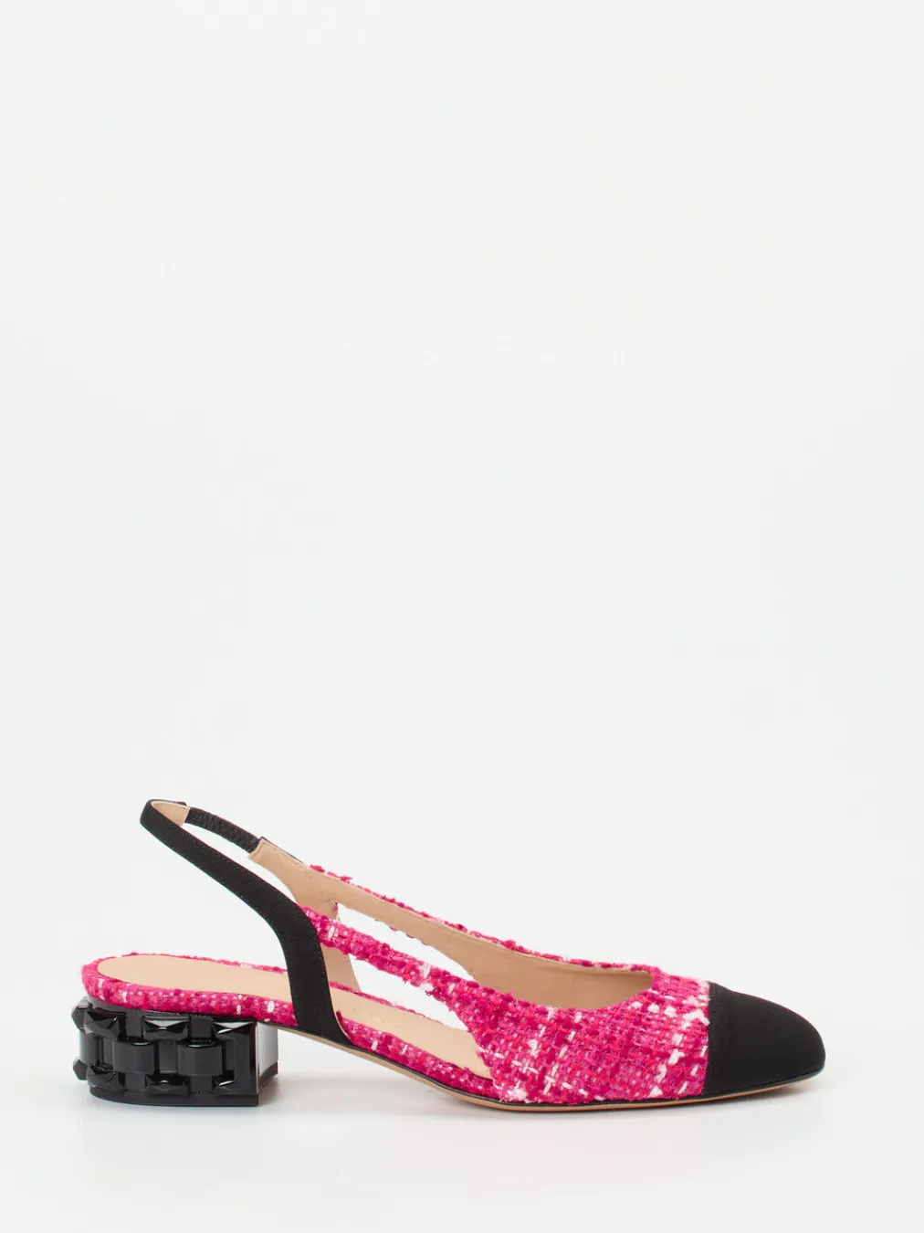 Der strukturierte Bouclé-Stoff in kräftigem Pink und der skulpturale Absatz zeigen modische Raffinesse mit architektonischem Anspruch.