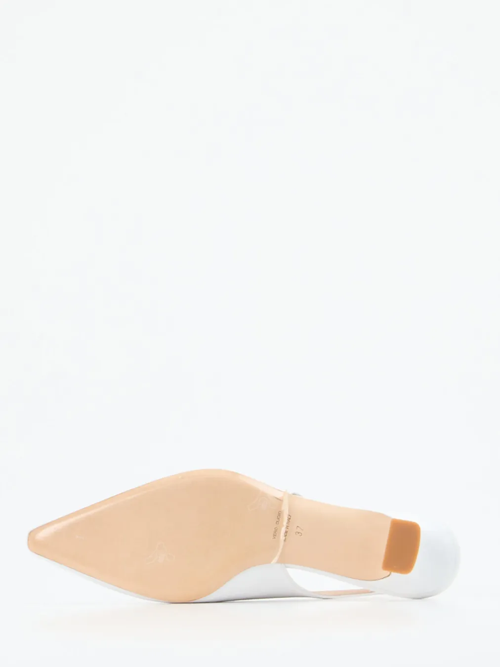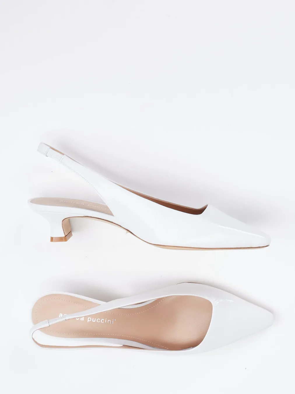 Weiße Eleganz mit subtiler Retro-Note.Andrea Puccini interpretiert klassische Slingback-Pumps neu. Diese Damenschuhe aus weißem, leicht geknautschtem Lackleder setzen mit spitzem Leisten und asymmetrischem Dekolleté feminine Akzente. Der elastische Slingback-Riemen sorgt für sicheren Halt, während der 3 cm hohe Kitten Heel Komfort und Stil vereint. Design-Details wie Ton-in-Ton-Nähte unterstreichen das minimalistische Konzept, inspiriert vom Quiet Luxury und 90s-Vintage. Ideal zu leichten Sommerkleidern oder cleanen Blazern gestylt. Ein Modell mit dezentem Luxusanspruch und geschmackvoller Zurückhaltung.