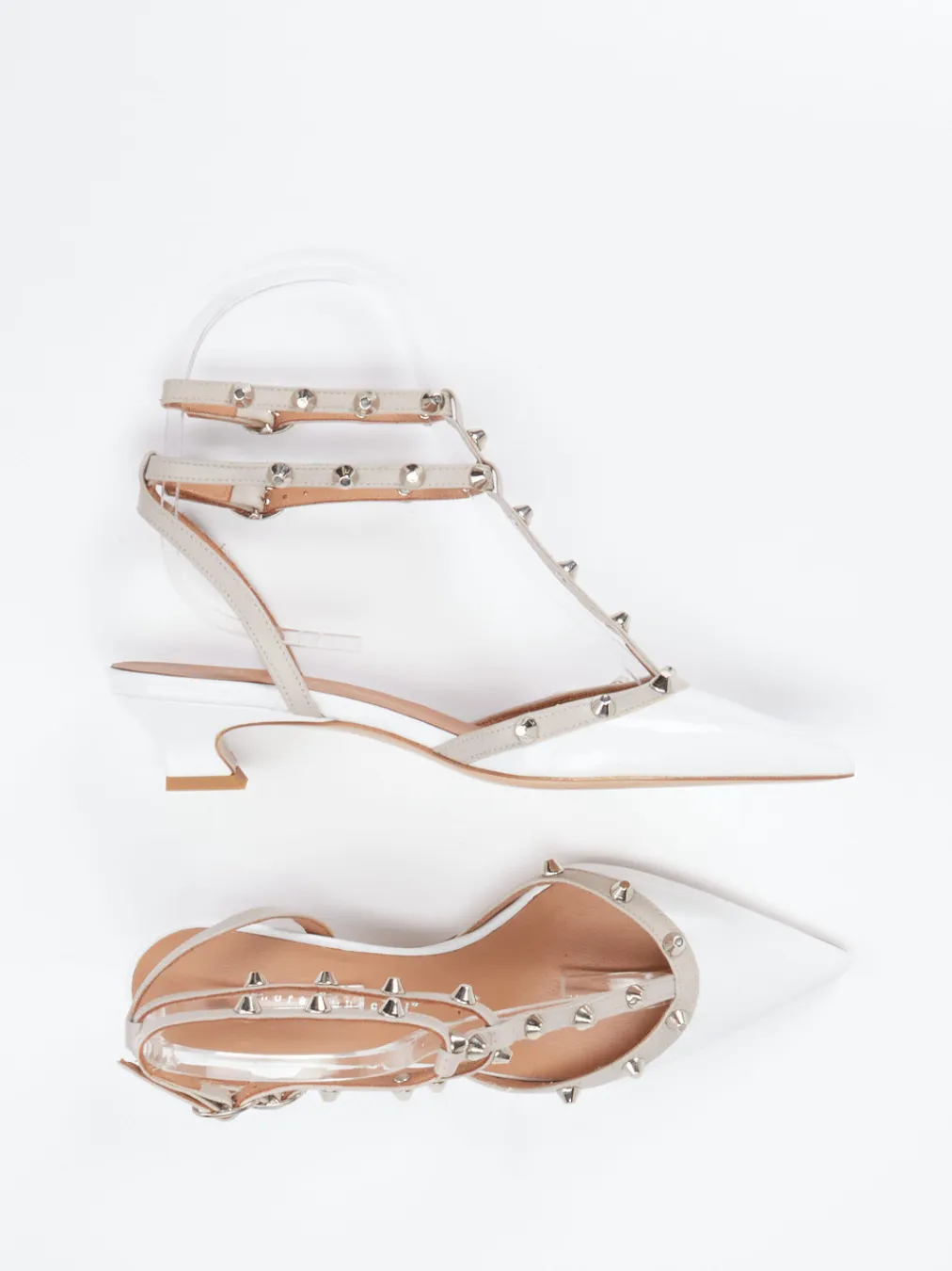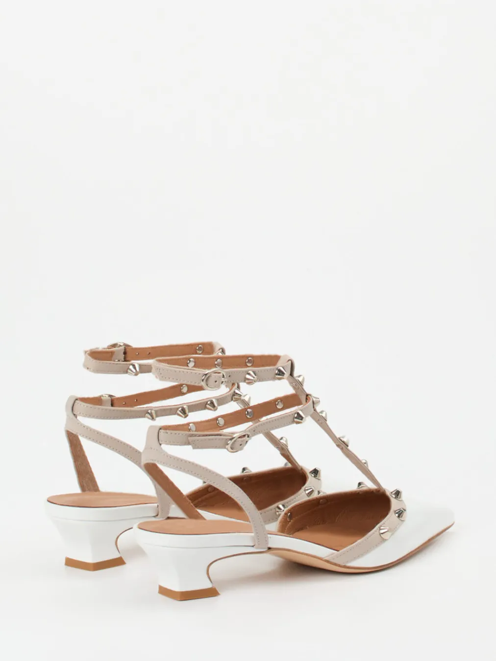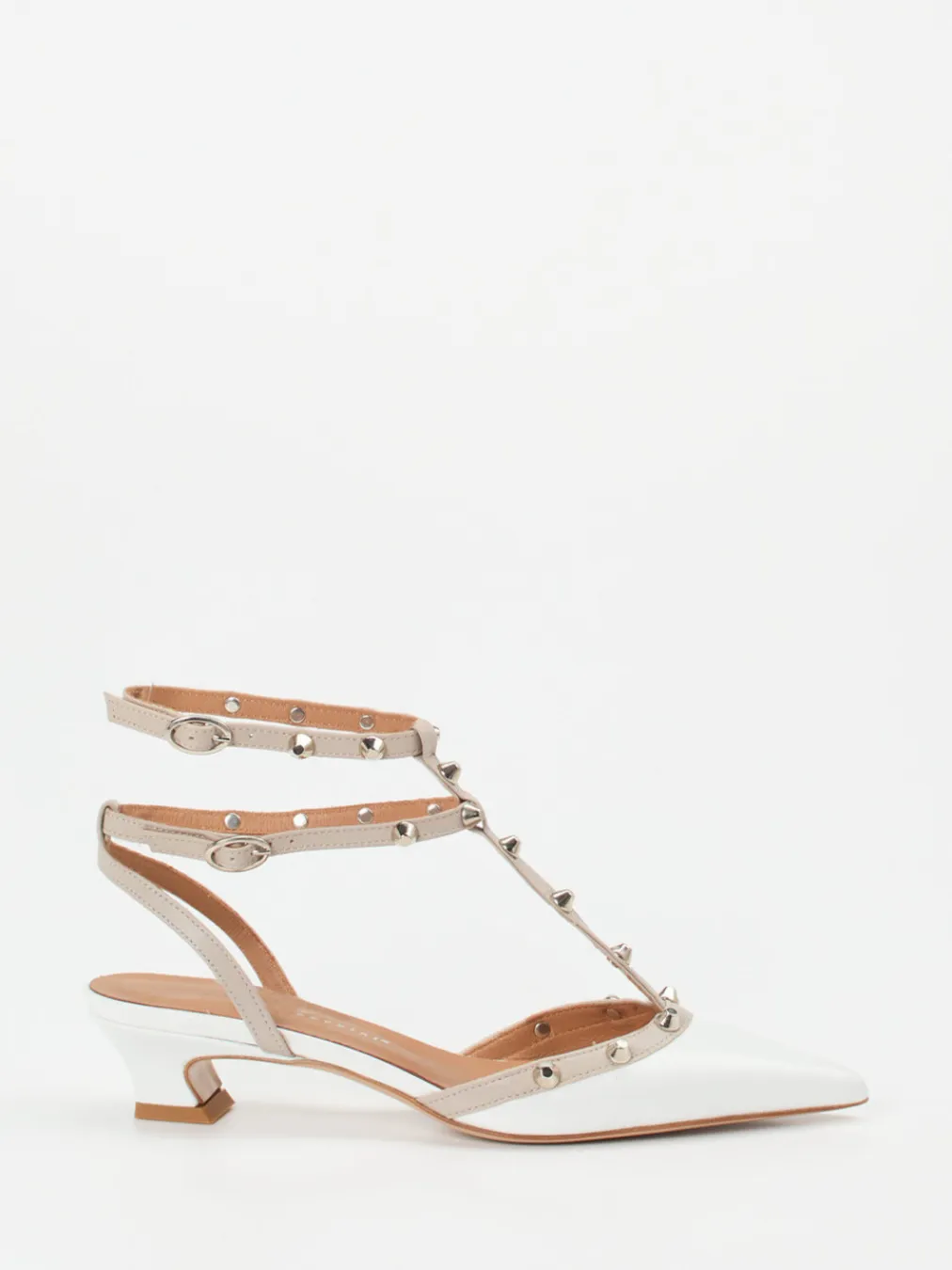 Bei Ausgehanlässen oder stilvollen City-Tagen überzeugen die Pumps mit ihrem glänzenden Lackleder in frischem Weiß, ergänzt durch eine spitz zulaufende Silhouette. Silberfarbene Nieten und kontrastfarbene T-Riemen sorgen für markante Akzente im Stil des Rock-Chic. Die verstellbaren Knöchelriemen garantieren einen passgenauen Sitz, während der 3,5 cm hohe Kitten Heel und die gepolsterte Lederinnensohle bequemen Tragekomfort bieten. Ideal kombinierbar mit Midirock oder heller Skinny Jeans für trendige Auftritte.