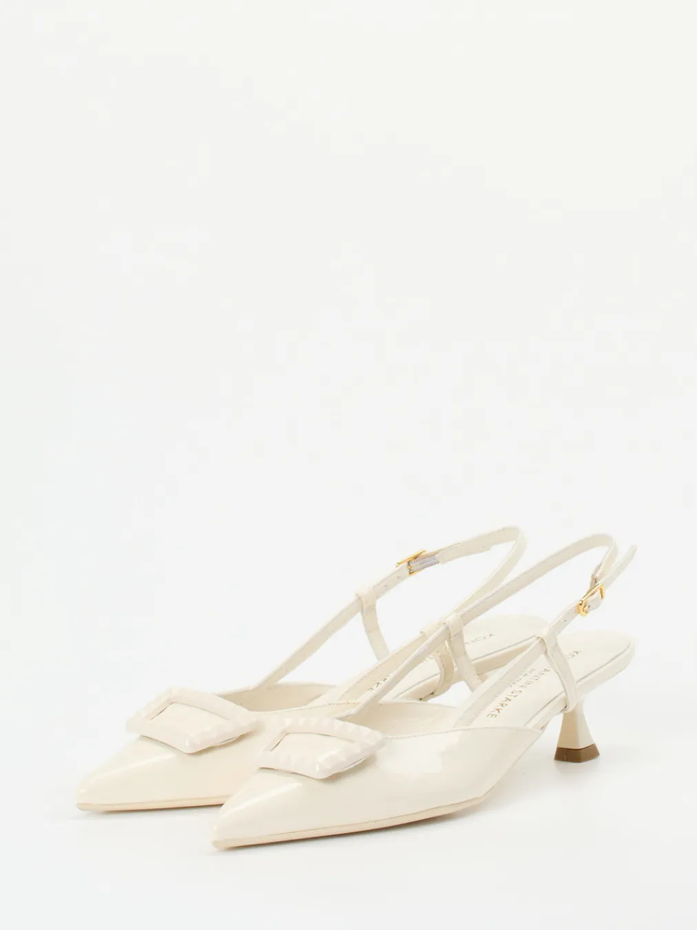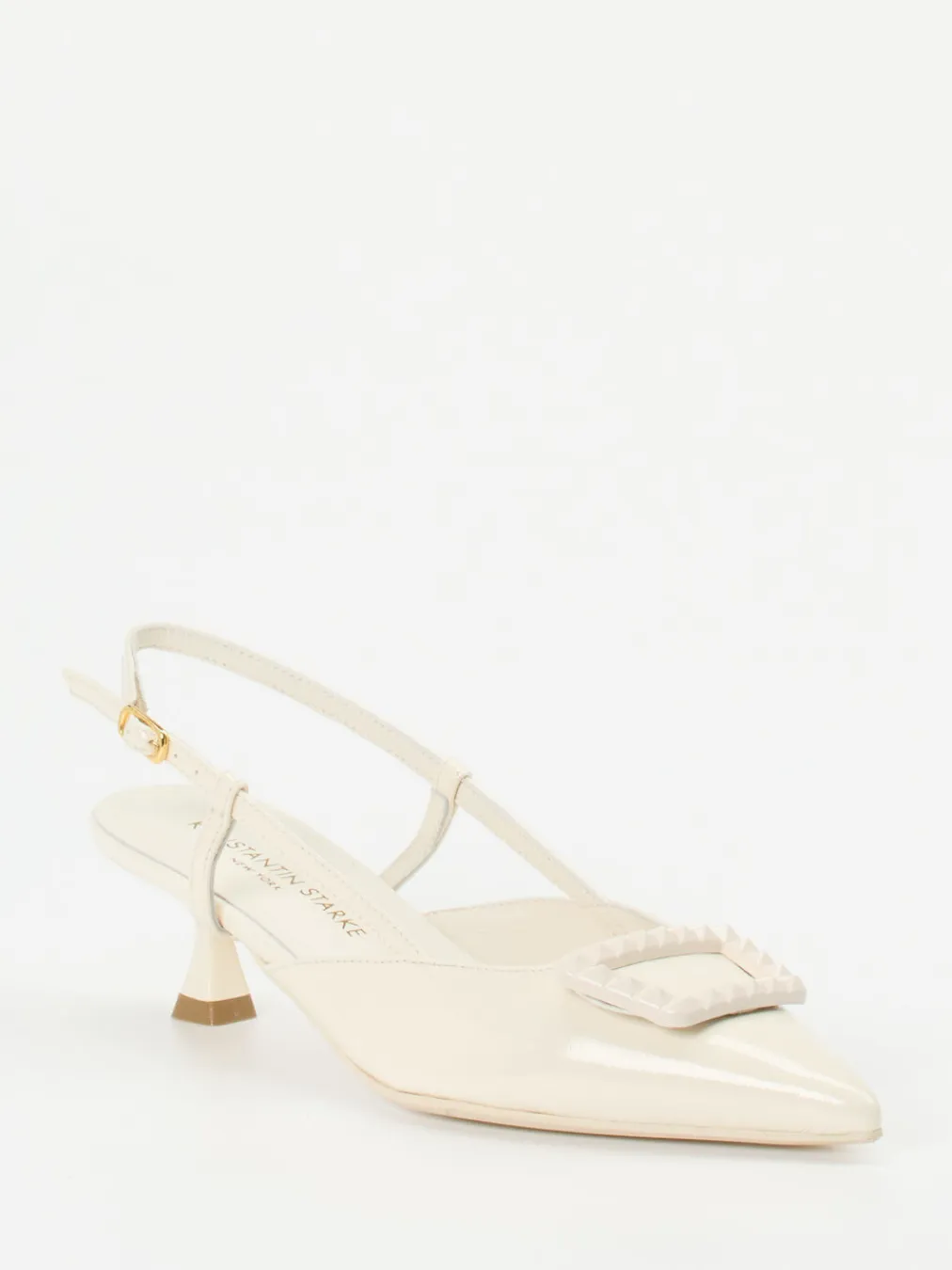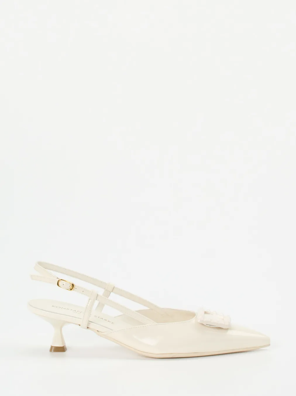 Stilvolle Eleganz im Quiet-Luxury-Look.Konstantin Starke präsentiert feminine Slingback-Pumps aus hochwertigem Lackleder. Ideal für festliche Anlässe oder elegante Abendveranstaltungen: Das cremeweiße Lackleder schimmert luxuriös auf dem spitz zulaufenden Leisten. Ton-in-Ton gehaltene Pyramidennieten zieren die dekorative Kunststoffschnalle auf dem Spann. Der schmale Riemen mit verstellbarer, goldfarbener Metallschließe akzentuiert die Ferse und sorgt für optimalen Sitz. Mit 5 cm hohem Kitten Heel greift das Modell stilvoll den Trend „Quiet Luxury“ auf. Dezenter Vintage-Charme trifft auf modernen Minimalismus. Ein feiner Look für Liebhaberinnen klassisch-minimalistischer Designs.