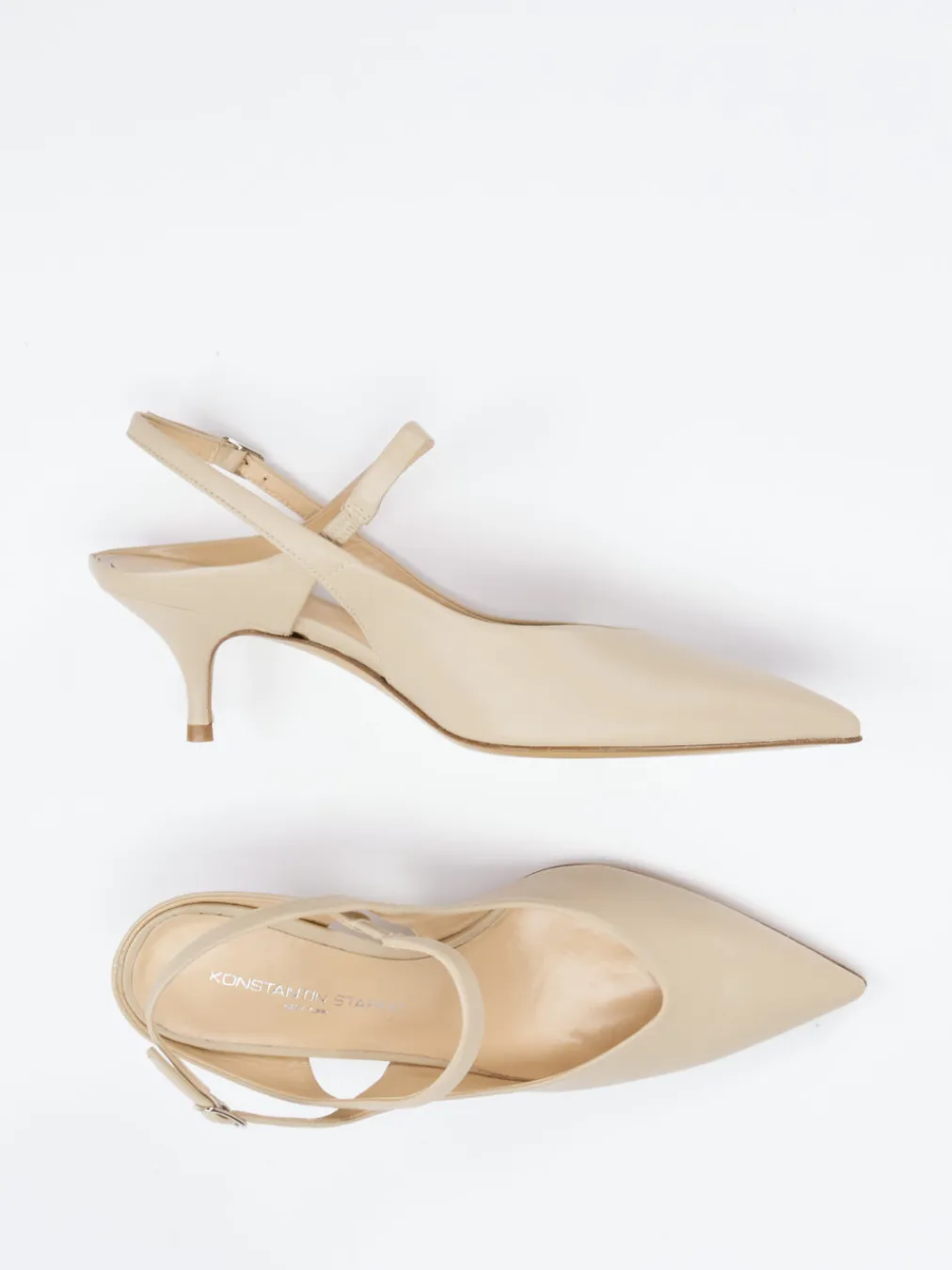 Feine Kontur für besondere Anlässe.Konstantin Starke präsentiert elegante Slingback-Pumps für Damen mit stilvoller Ausstrahlung. Ob Business-Dinner oder festlicher Empfang – dieses Modell erfüllt gehobene Stylingansprüche. Gefertigt aus nudefarbenem Lammleder, ergänzt durch eine matte Oberfläche, unterstreicht die spitz zulaufende Silhouette den femininen Minimalismus. Zwei filigrane Riemchen mit stufenlos verstellbarer Schließe sorgen für sicheren Halt, während ein elastischer Einsatz Druckstellen vorbeugt. Der 5 cm hohe Kitten Heel bietet eleganten Auftritt und angenehmen Laufkomfort. Ideal kombinierbar mit Seidenbluse und Clutch in Nude für einen ruhigen, modisch akzentuierten Look. Stilvolle Klarheit trifft auf handwerkliche Eleganz – Konstantin Starke Qualität.