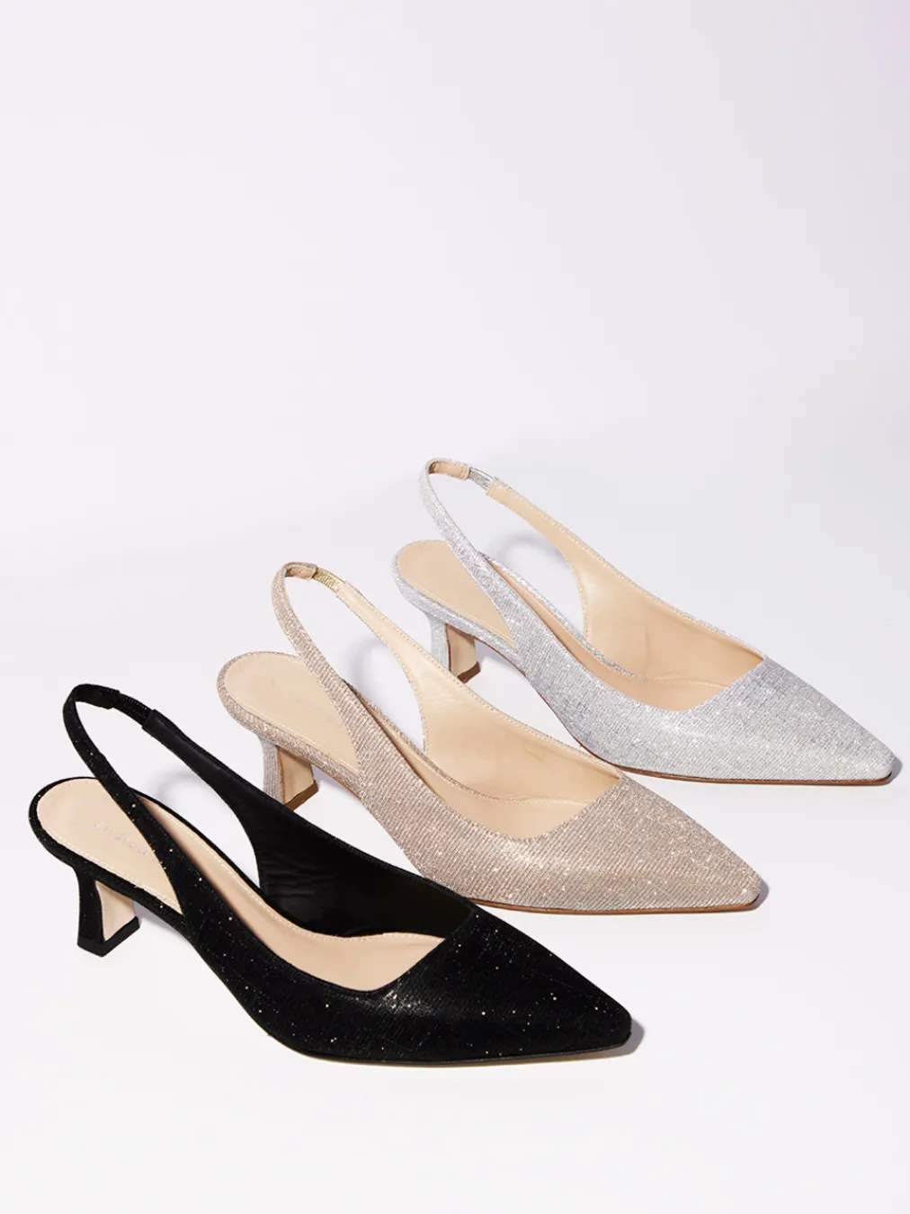 Die Slingback-Pumps vereinen einen edlen Glitzereffekt mit femininer Silhouette – perfekt für festliche Looks mit dezentem Glamour. Der Mid-Heel sorgt für eleganten, komfortablen Auftritt.