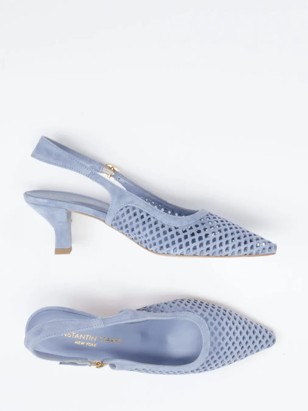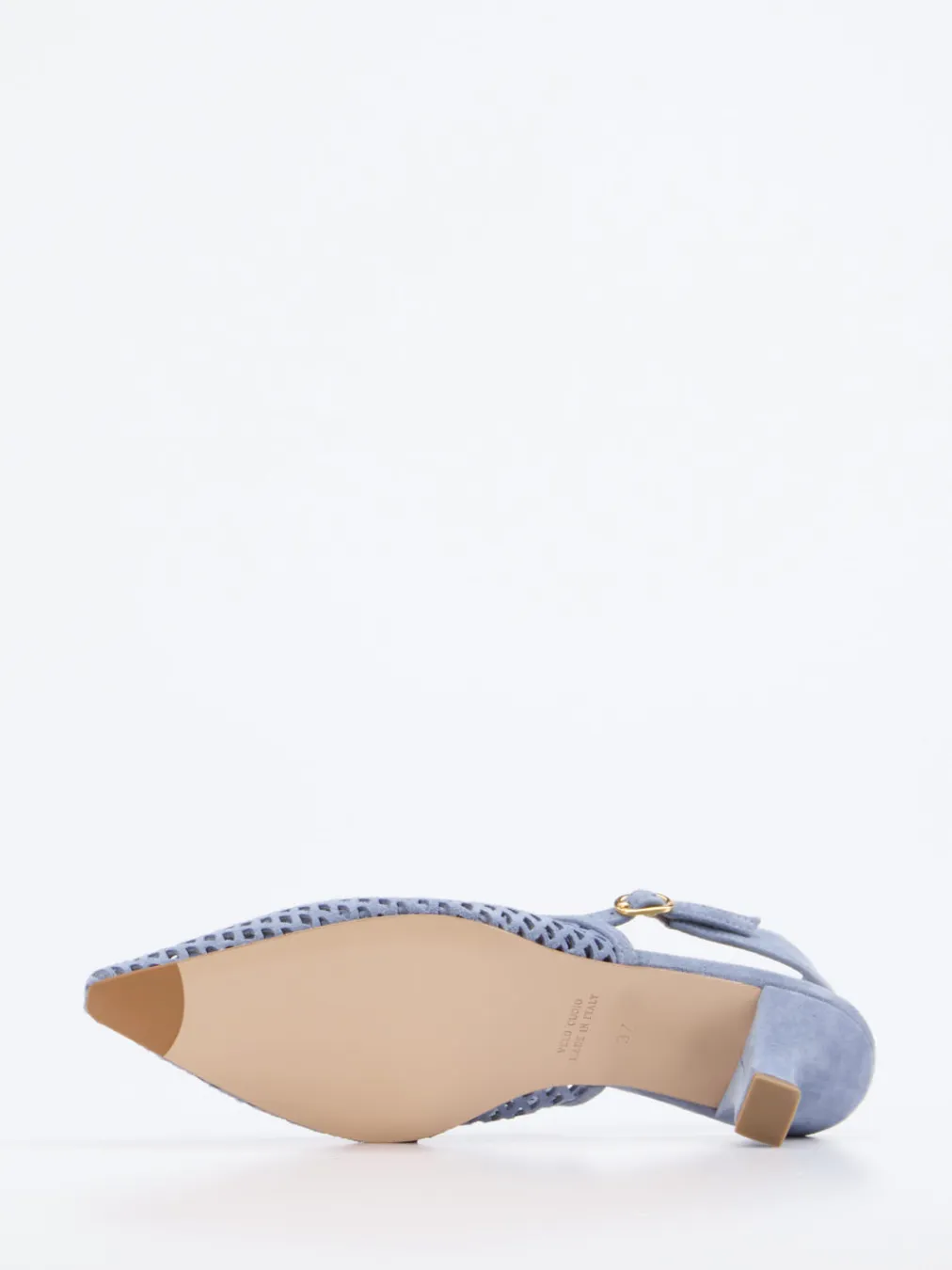 Ideal für warme Tage im Büro oder bei Anlässen, bei denen feminine Eleganz gefragt ist. Aus hochwertigem Veloursleder gefertigt, zeigt sich das pastellblaue Obermaterial samtig matt mit durchbrochener Mesh-Optik. Die betont spitze Silhouette und der 6 cm hohe Kitten Heel unterstreichen den Vintage-Flair. Ein verstellbarer Fersenriemen mit goldfarbener Schnalle sorgt für Passgenauigkeit. Farblich abgestimmtes Innenfutter aus Lammnappa erhöht den Tragekomfort.