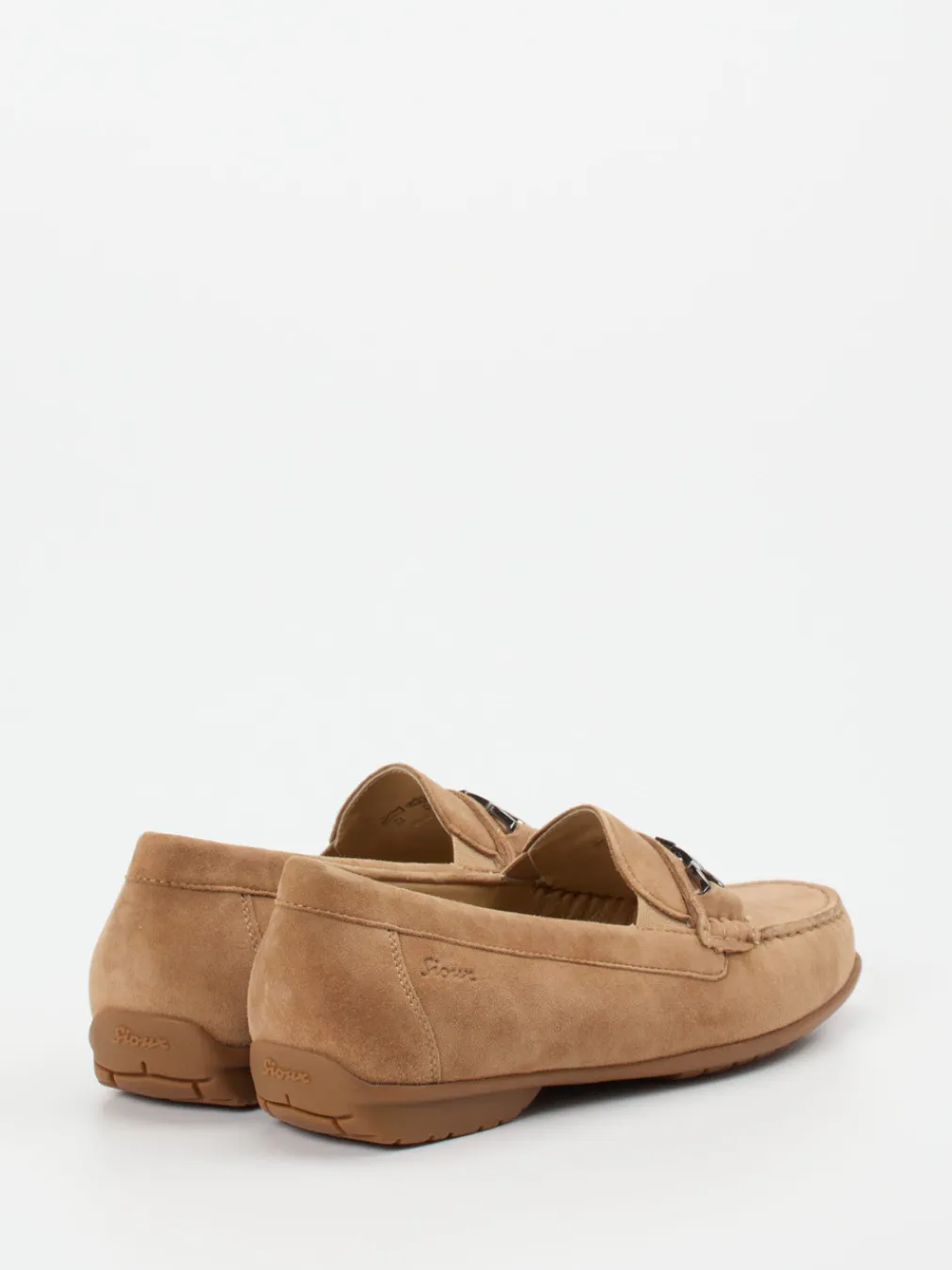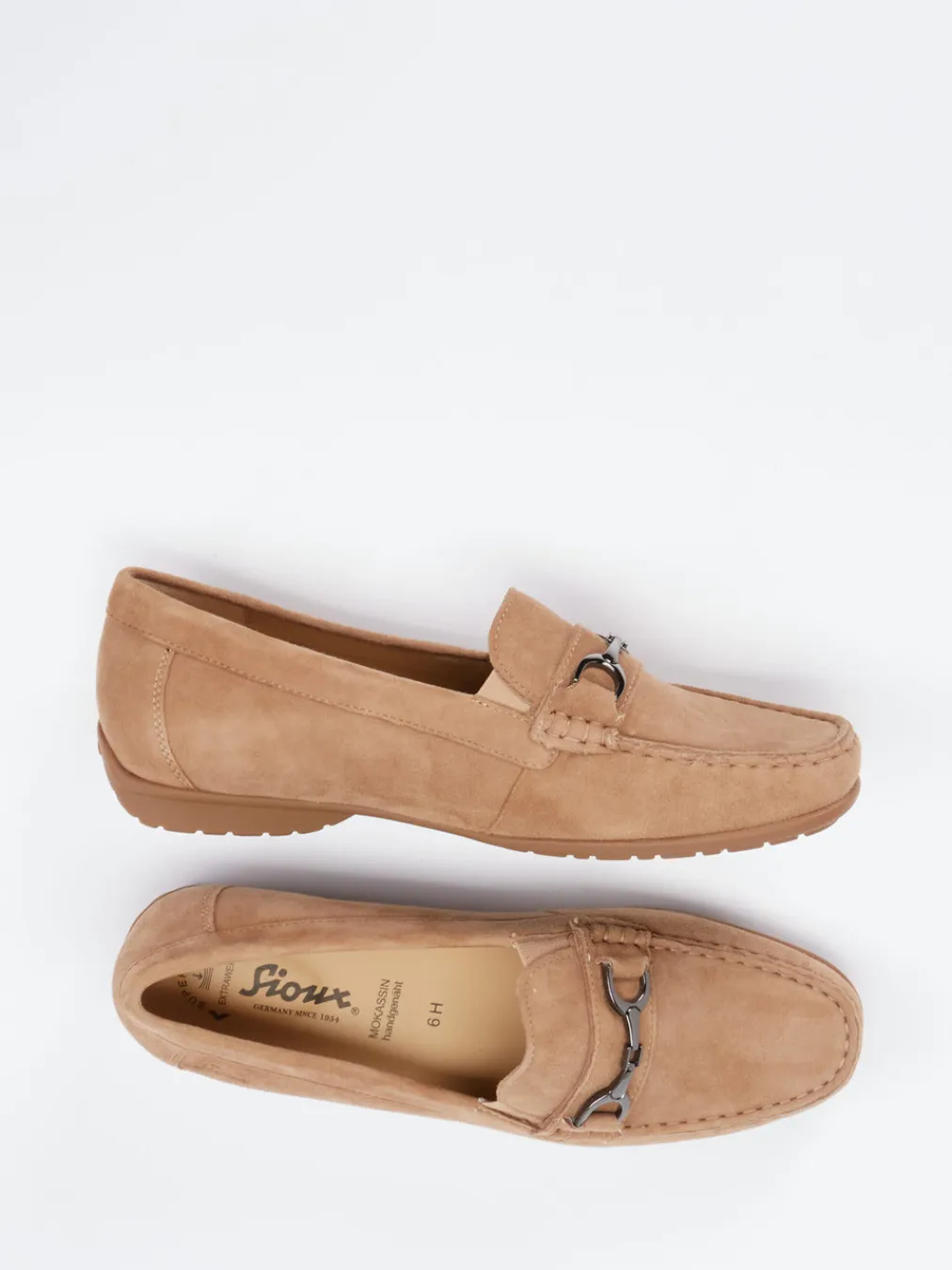 Einen schicken, beigen Slipper präsentiert hier die Marke Sioux. Samtweiches Veloursleder sorgt für einen tollen Tragekomfort. Eine Loaferlasche und die kräftig gesteppte Mokassinnaht verleihen einen sportiven Eindruck. Das tonige Kettenaccessoire ist ein attraktives Detail. Von innen mit einer Lederfütterung ausgestattet, hat dieser Schuh die Weite H und kommt in der Form Cocoa-H. Die Laufsohle besteht aus flexiblem Gummi mit Profil und die Decksohle ist sehr weich gepolstert. So wird dieser Slipper zu einem perfekten Sommerschuh.