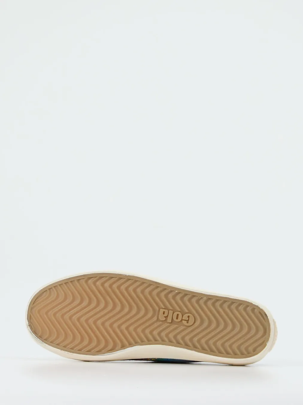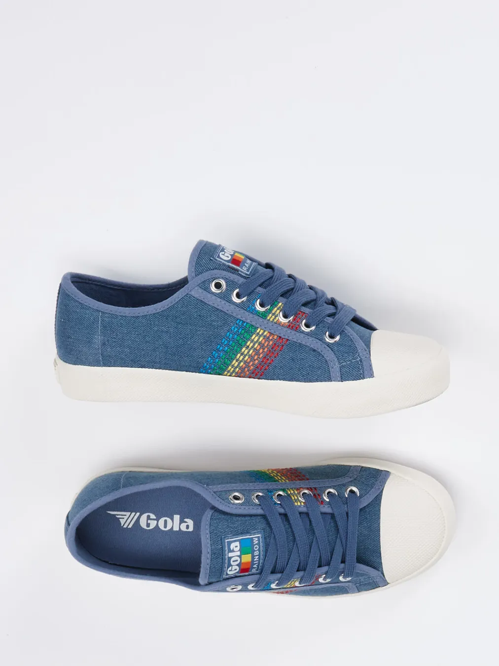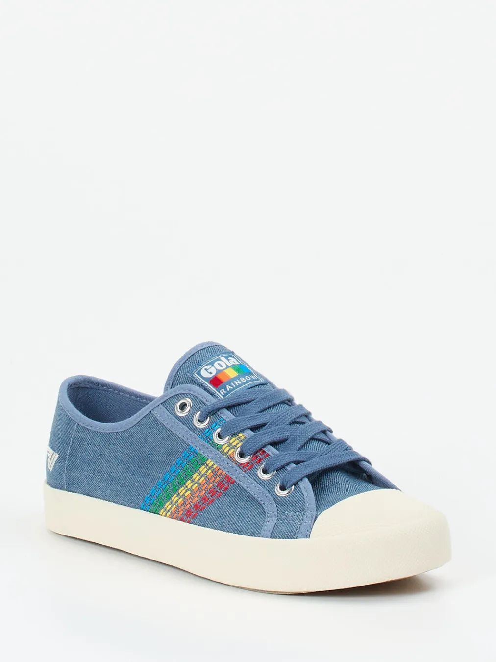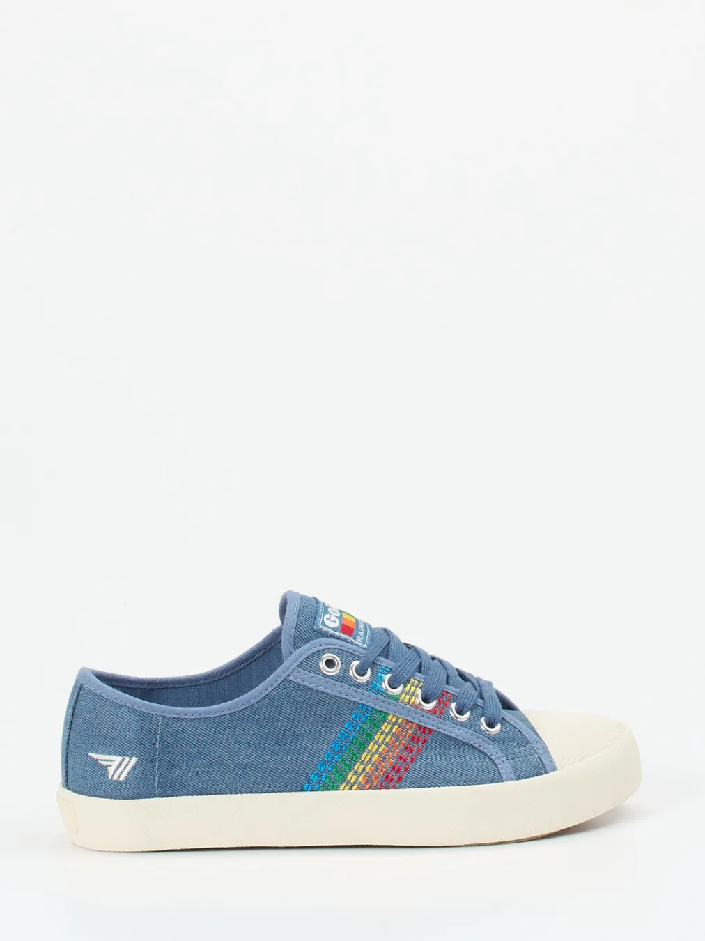 Stilvoller Alltagsbegleiter mit Retro-Flair.Gola präsentiert einen Sneaker aus der Kategorie Canvas-Schuhe, der mit klarem Design und markentypischem Vintage-Appeal überzeugt. Ob beim Stadtbummel oder im Urlaub – das atmungsaktive Obermaterial aus veganem Canvas sorgt für ein angenehmes Trageklima. Die jeansblaue Grundfarbe trifft auf farbenfrohe Akzente in Form einer Regenbogen-Stickerei, ergänzt durch silberfarbene Ösen und ein Markenlabel auf der Zunge. Die flache Silhouette mit robust profilierter Gummisohle bietet zuverlässigen Halt im Alltag. Ausdrucksstark im Y2K-Stil und ideal kombinierbar zu Jeans oder Shorts. Gola verbindet trendbewusstes Design mit bewusstem Materialeinsatz für urbanen Komfort.