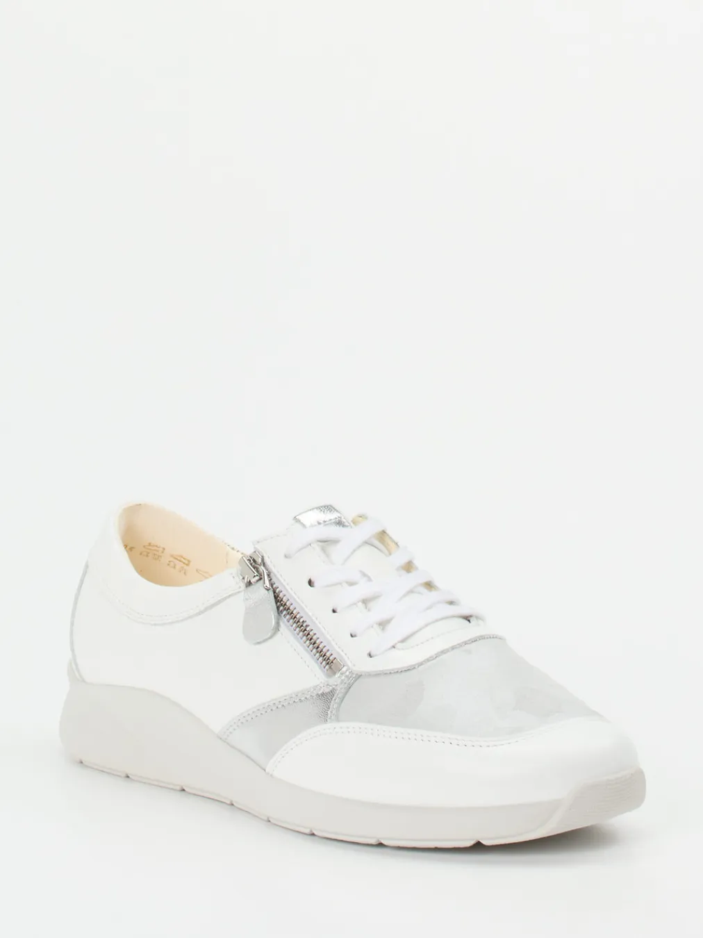 Sportlicher Komfort mit Stilanspruch.Christian Dietz zeigt mit diesem Sneaker einen modisch-funktionalen Begleiter aus der Komfortlinie. Für entspannte Wege durch Stadt und Alltag sorgen die dämpfende Gummisohle sowie die ausgezeichnete Passform mit Weite H. Das verwendete Kalbleder ist matt gehalten und wird durch silberfarbene Metallic-Akzente sowie dezente Camouflage-Effekte stilvoll aufgewertet. Der Reißverschluss an der Seite erleichtert das Anziehen, während das atmungsaktive Innenleben aus Leder und Textil ein angenehmes Tragegefühl bietet. Der klassisch-runde Schnitt folgt minimalistischen Designlinien, die sich vielseitig kombinieren lassen – etwa mit weißen Jeans oder leichten Jacken. Ein Sneaker, der Komfort und urbanes Design souverän vereint.