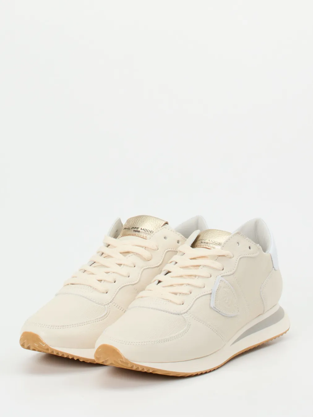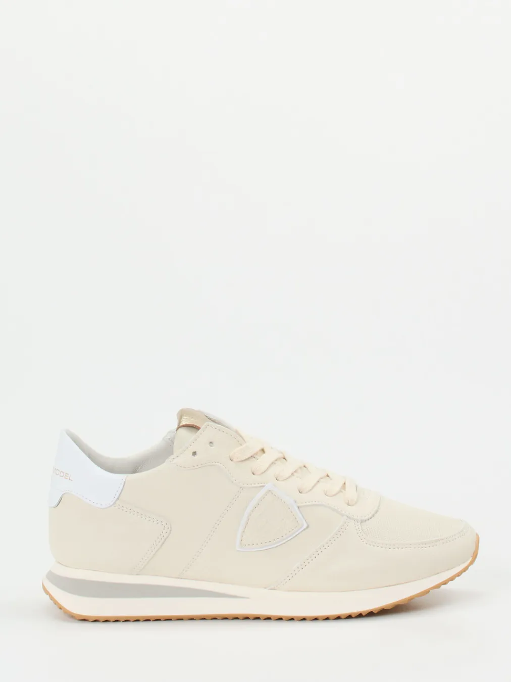 Ob für City-Touren oder entspannte Reisetage – die Kombination aus hochwertigem Kalbleder, samtiger Haptik und textilen Partien überzeugt durch Leichtigkeit und Struktur. Der cremeweiße Grundton wird durch eine glänzende Zunge aus goldfarbenem Metallicleder sowie eine weiße Fersenkappe mit dezentem Logo akzentuiert. Handwerkliche Nähte und tiefe Fischgrätprofilierung unterstreichen das sportlich-elegante Gesamtbild. Ideal zu hellen Leinenhosen oder fließenden Sommerkleidern.
