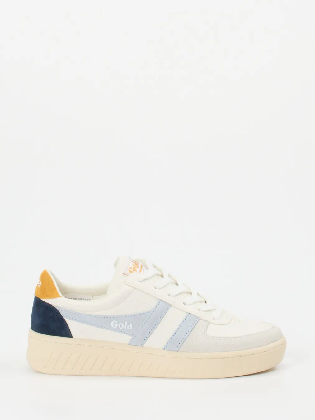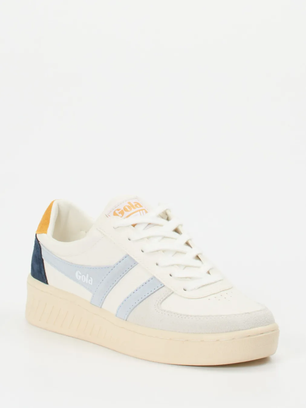 Trendfarben neu interpretiert.Gola präsentiert mit diesem Sneaker ein Modell der Kategorie Retro-Sneaker mit Vintage-Charakter. Für urbane Freizeitmomente mit modischer Aussage bietet das Obermaterial aus Glattleder samt Veloursleder-Applikationen eine harmonisch strukturierte Oberfläche. Das Offwhite-Grunddesign wird durch hellblaue, navyfarbene und senfgelbe Details dynamisch akzentuiert. Schnürung, genarbte Textur und ein kremiger Gummiboden sorgen für Stil und Komfort – ergänzt durch verstärkte Fersenelemente und orangefarbene Logos. Das leder- und textilgefütterte Innenleben sichert ein angenehmes Tragegefühl. Stilistisch verankert in den aktuellen 90s- und Streetwear-Trends, überzeugt der Schuh im Color-Blocking-Look. Unisex-Sneaker mit klarer Formsprache und trendorientierter Ausstrahlung.