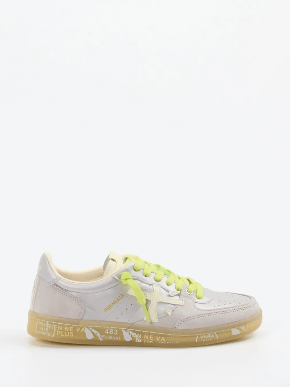 Streetwear mit Stilpotenzial.Premiata präsentiert mit diesem Sneaker ein Statement-Stück der zeitgenössischen Mode. Für urbane Styles mit trendiger Note bietet dieser Low-Top-Sneaker ein stilvolles Zusammenspiel aus silberfarbenem Metallicleder und samtig angeschliffenem Veloursleder. Die hellgraue Grundfarbe wird durch leuchtend neongelbe Schnürsenkel kontrastiert, während das klassische flache Design von einer markant bedruckten, transparenten Gummisohle getragen wird. Ein seitliches Logo-Overlay sowie eine perforierte Zehenkappe akzentuieren die sportive Silhouette. Das Modell überzeugt durch ein bequemes, wechselbares Lederfußbett und eignet sich ideal für Freizeit- und Partykombinationen mit Cargo-Hose oder Satinrock. Premiata steht für innovative Ästhetik mit luxuriösem Komfortanspruch.