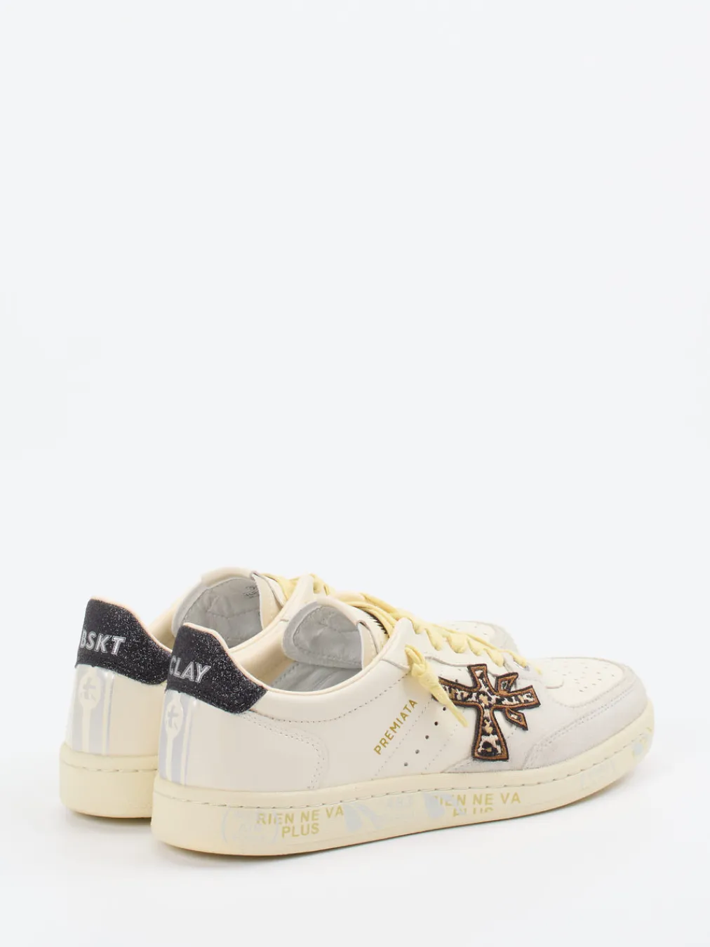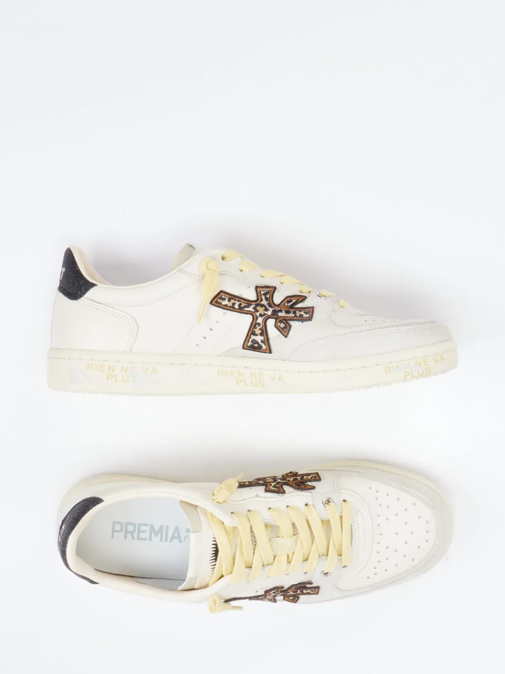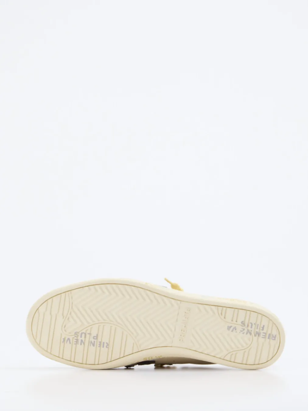Retro-Chic mit Animal-Highlight.Premiata erweitert die Sneaker-Kollektion um einen modischen Low-Top für Damen. Ideal für urbane Spaziergänge oder kreative Freizeit-Outfits bietet der Schuh eine gelungene Kombination aus samtig angeschliffenem Veloursleder und Glattleder. In Cremeweiß mit pastellgelben Kontrasten gehalten, setzt ein auffälliges Leoparden-Logo einen expressiven Akzent. Die profilierte Gummisohle mit Schriftzug vereint Retro-Sportswear mit Y2K-Flair und Komfort. Dank gepolstertem Schaftrand und ledergefüttertem Innenraum eignet sich das Modell auch für längere Wege. Perfekt zu Jogpants und Oversized-Hoodies für einen lässigen Streetstyle. Ein Designstatement mit sportlichem Komfort und italienischer Handschrift.
