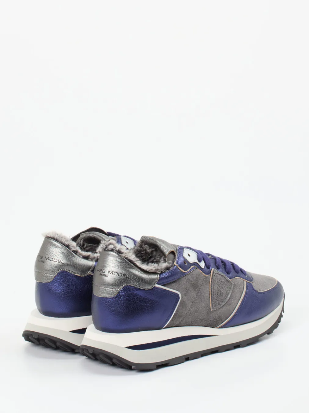 Stilvolles Statement für kühlere Tage.Philippe Model interpretiert den Retro-Runner neu – dieser Sneaker vereint sportliche Dynamik mit effektvoller Ästhetik. Ob beim Stadtbummel oder auf winterlichen Spazierwegen – das Modell punktet mit einem Materialmix aus grauem Veloursleder, lilafarbenem Metallicleder und Funktions-Textil. Die anthrazitgraue Grundfarbe wird durch silberne und blau-violette Akzente modern ergänzt. Ein gepolstertes Wechselfußbett und das sichtbare Kunstfell-Futter bieten hohen Tragekomfort an kalten Tagen. Die profilstarke Gummisohle rundet den Look funktional ab und unterstreicht die Outdoor-Tauglichkeit. Trendstark zum Oversized-Parka oder Steppmantel. Ein komfortstarker Wintersneaker im trendigen Metallic-Stil mit markentypischer Detailverliebtheit.