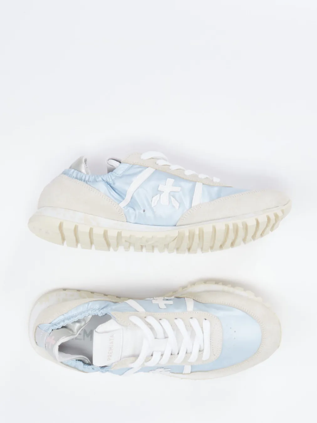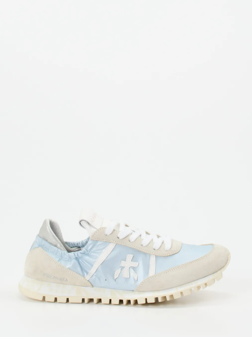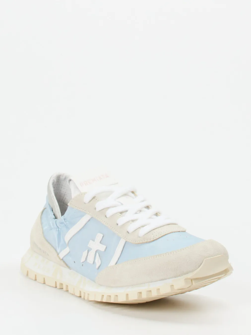 Leichtigkeit trifft Retro-Charme.Premiata kombiniert bei diesem Damen-Sneaker sportliche Raffinesse mit nostalgischem Design. Für urbane Tage mit stilvollem Anspruch sorgt die Verbindung von samtig angeschliffenem Veloursleder, glattem Textil und robustem Nylon. Das pastellblaue Obermaterial mit weißen und offwhitefarbenen Details verleiht dem Modell seinen soften, sommerlichen Look. Die klassische, flache Silhouette mit Retro-Profilsohle und Logodetails auf Zunge und Ferse greift Vintage-Elemente der 90er-Jahre auf. Schnürung, Gummisohle und gepolsterter Fersenbereich steigern den Tragekomfort. Perfekt für entspannte Looks mit weiter Hose oder Jogpants. Ein starker Auftritt für trendbewusste Casual-Outfits mit ikonischem Premiata-Stil.