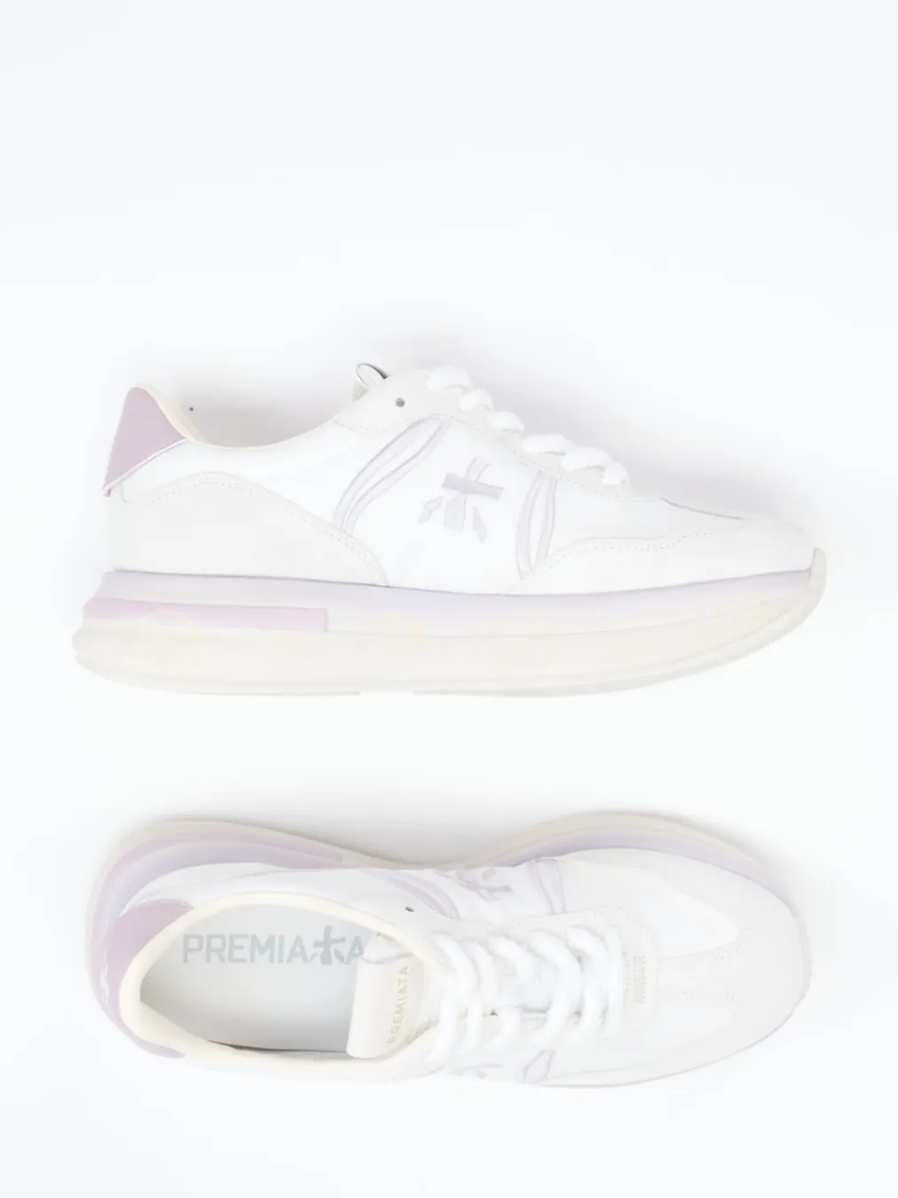 Dieser Premiata-Sneaker kombiniert samtiges Veloursleder mit feinem Nylontextil in softem Weiß-Flieder-Kontrast. Ideal für modische Looks der neuen Saison.