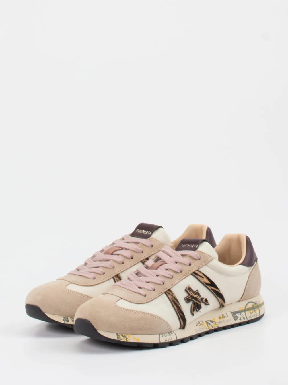 Statement in Beige mit Animal-Details.Premiata interpretiert den Damen-Sneaker im Stil eines Retro-Runners neu. Für urbane Tage mit modischem Fokus bietet dieser cleane Sneaker aus weichem Veloursleder und feinem Nylon beste Voraussetzungen. Cremeweiße Glattpartien treffen auf beigefarbene Velours-Overlays, ergänzt um einen markanten Animal-Print und eine individuell gestaltete mehrfarbige Gummisohle mit Profil. Die flache, schmale Silhouette mit gepolstertem Schaftrand sorgt für Komfort, die Schnürung für sicheren Sitz. Streetwear trifft auf subtile Exklusivität – ein Trendmodell mit Statement-Charakter. Passt hervorragend zu Bomberjacken oder Crossbody-Bags in Naturtönen. Premiata vereint stilechte Retro-Vibes mit hochwertigem Materialanspruch.