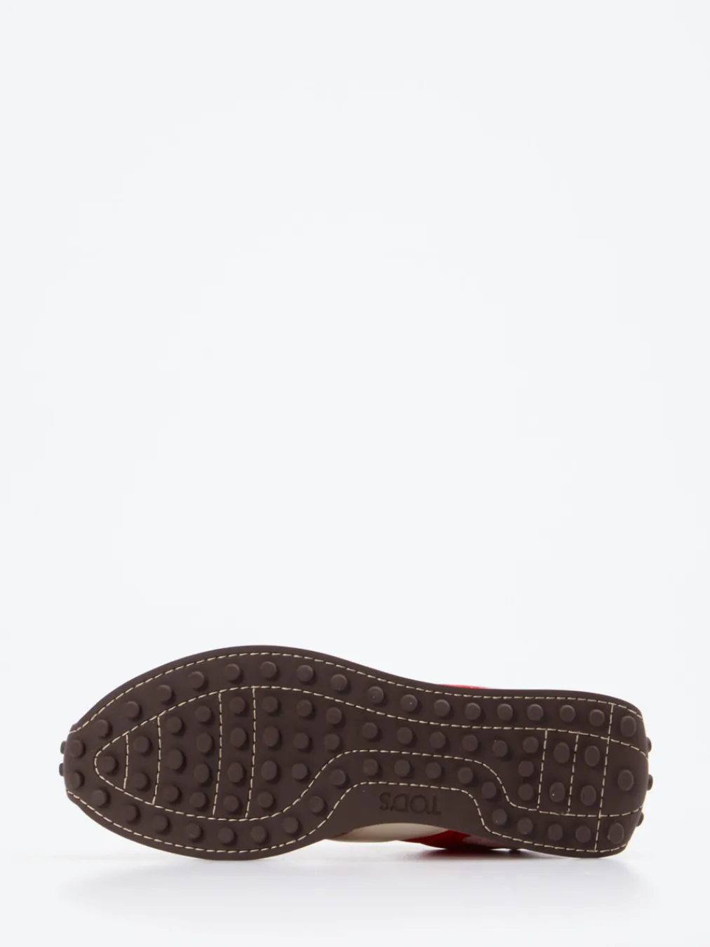 Fashion-Statement auf Schritt und Tritt. Tod’s präsentiert mit diesem Sneaker eine stilvolle Hommage an den 90s-Retro-Runner-Trend. Für urbane Alltagssituationen bietet der Unisex-Sneaker mit Veloursleder und textilem Nylonmaterial zuverlässigen Komfort und modische Präsenz. Farblich dominiert sanftes Rosé, akzentuiert durch Signalrot und Weiß im Colorblocking-Stil. Die klassische, flache Silhouette wird ergänzt durch markante Kontrastnähte, ein weißes Leder-Detail und eine strukturierte, profilierte Gummisohle. Dieser Schuh vereint sportliche Linienführung mit einem Look, der in Streetstyle und Freizeit optisch überzeugt. Perfekt zu Cropped-Jeans und lässigen T-Shirts. Ein ausdrucksstarker Begleiter – im luxuriösen Materialmix von Tod’s gedacht.