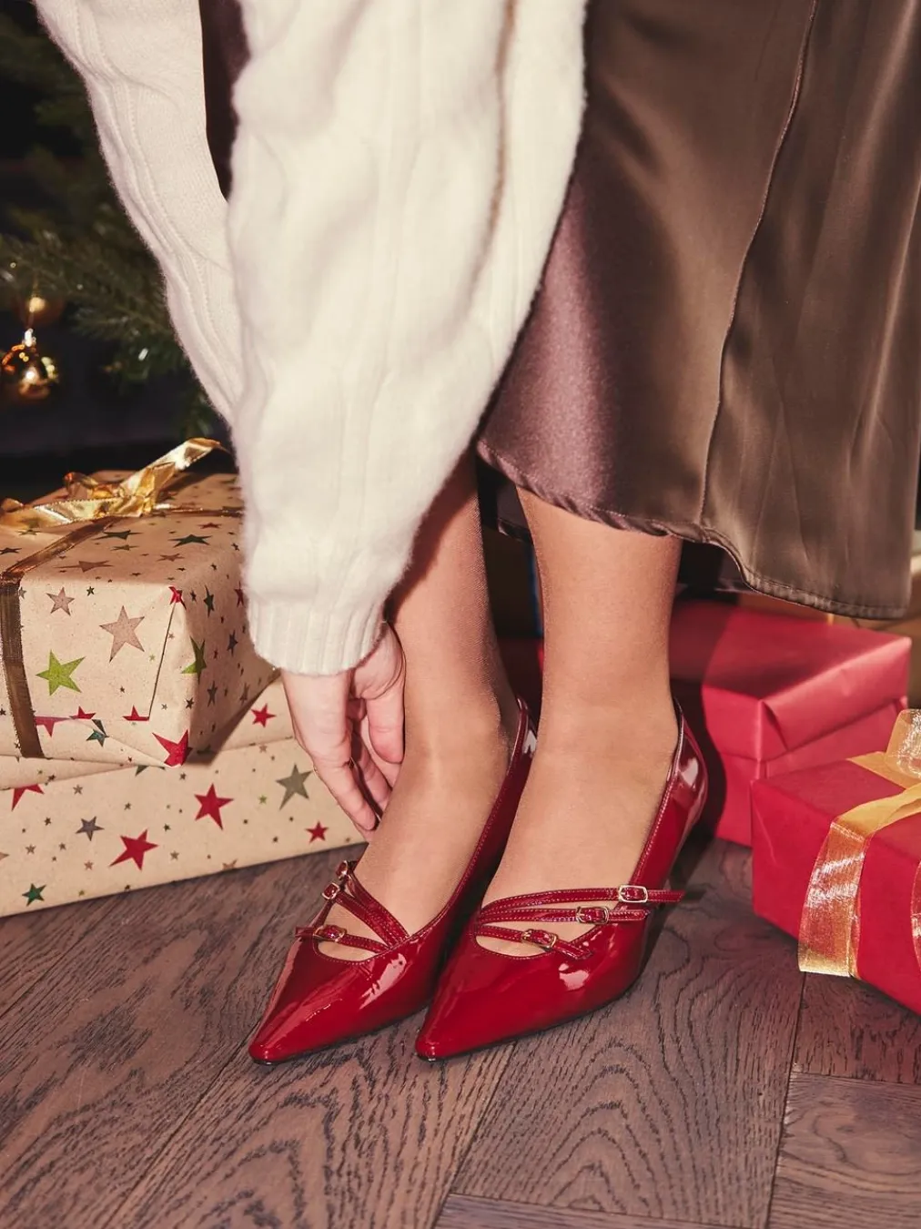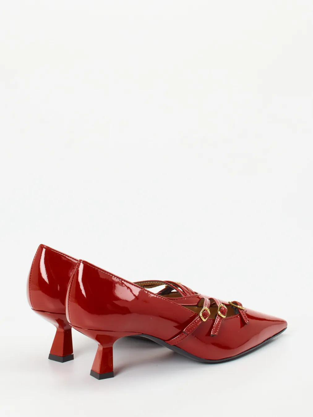 Eleganter Kitten-Heel mit glänzendem Finish, ideal für stilbewusste Auftritte mit femininer Note. Die goldfarbenen Schnallen setzen einen raffinierten Akzent.