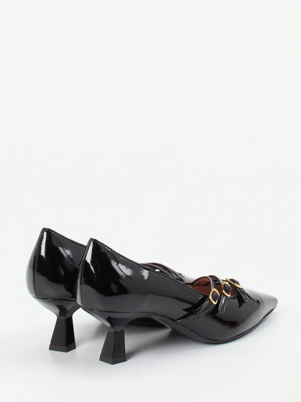 Konstantin Starke interpretiert klassische Damenpumps neu: Diese Spangenpumps überzeugen durch ihre schwarz-glänzende Lacklederoptik und feminine Silhouette.
