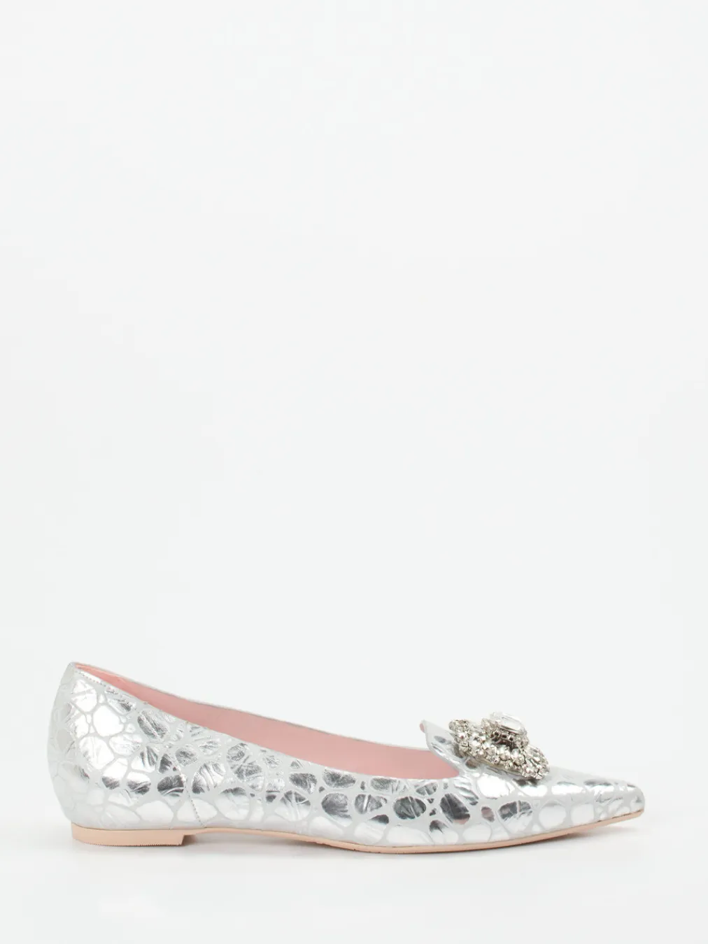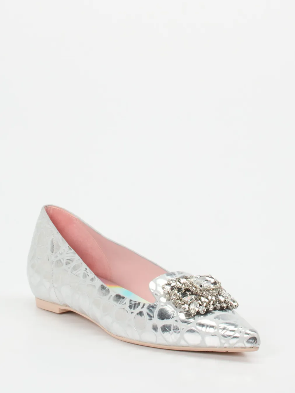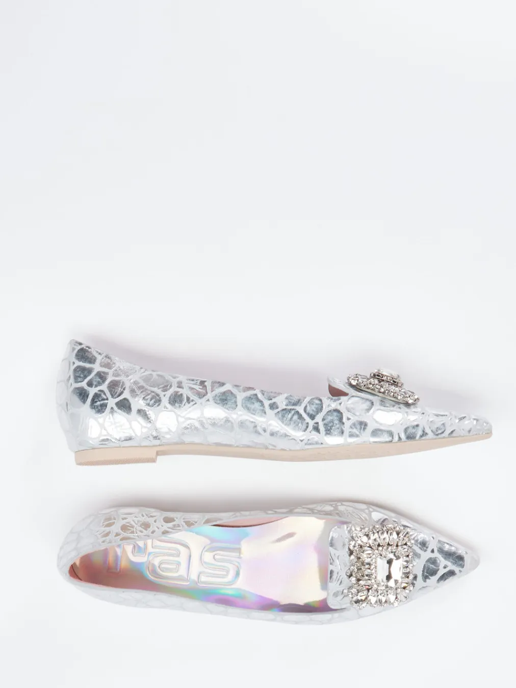 Spitz und glänzend ins Rampenlicht: Diese glamourösen Ballerinas von RAS leben von ihrer metallischen Krokoprägung und einer kristallbesetzten Agraffe.