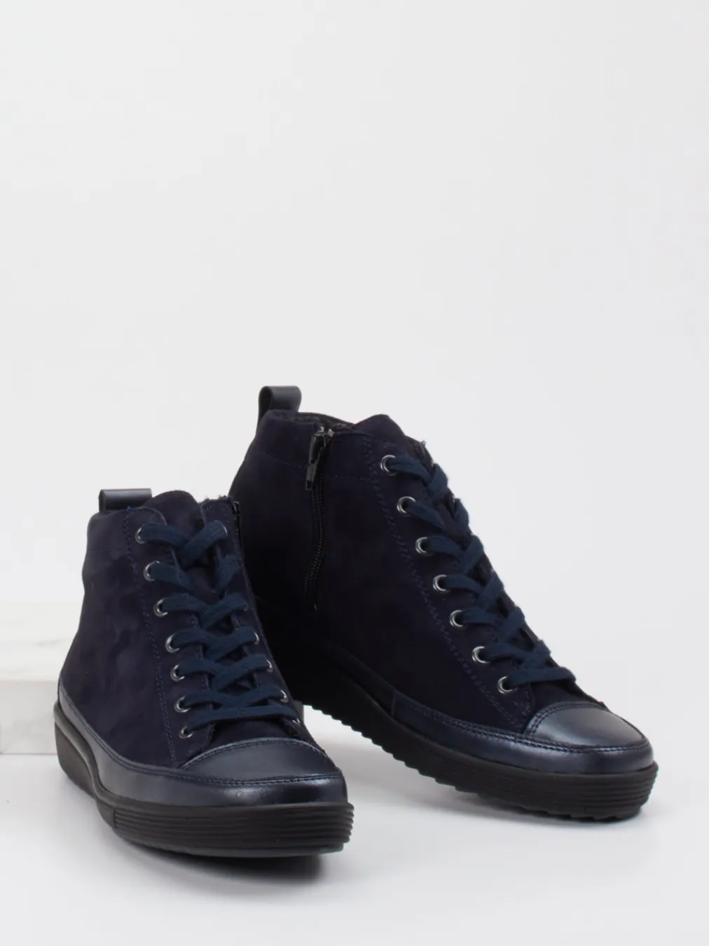 Diese komfortable Mid-Top-Stiefelette kombiniert samtiges Veloursleder mit dezenter Glattleder-Verstärkung. Der seitliche Zipper sorgt für zuverlässigen Einstieg auch an hektischen Tagen.