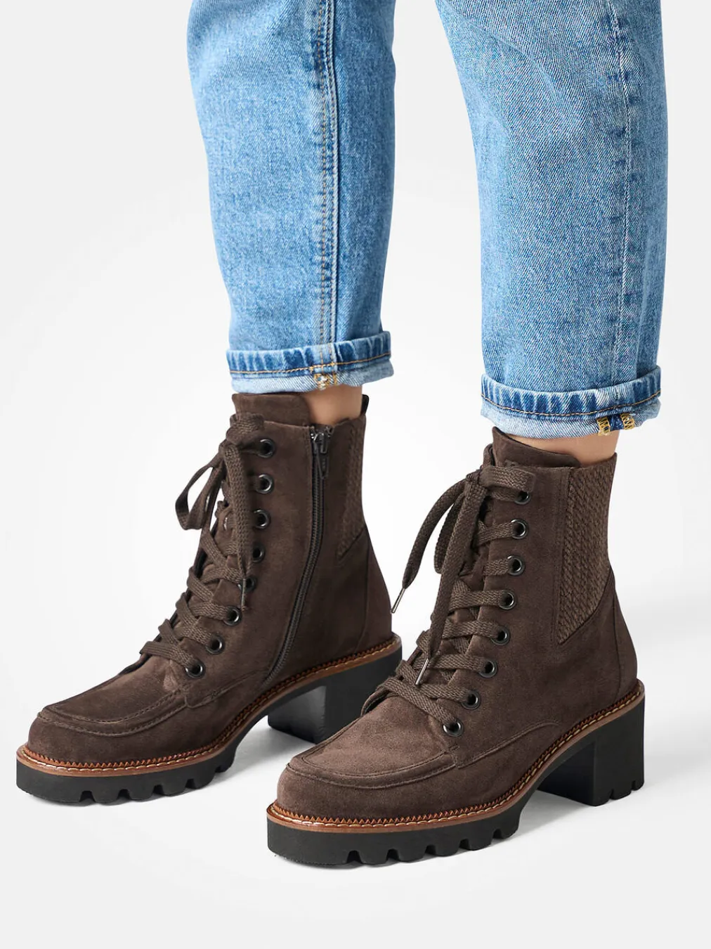 Chunky-Stil trifft Outdoor-Komfort.Paul Green präsentiert eine Schnürstiefelette für Damen, die Funktionalität mit modischem Anspruch verbindet. Für wechselhafte Herbsttage gemacht, überzeugt das Modell durch schokobraunes Veloursleder und eine matte Oberfläche mit textilen Strickdetails am Schaft. Die knöchelhohe, kompakte Form sitzt stabil, während der breite Blockabsatz mit hoher Profilsohle sicheren Tritt bietet. Praktisch: Schnürung und seitlicher Reißverschluss sorgen für optimalen Einstieg. Der Look passt perfekt in Utility-orientierte Freizeitgarderoben und harmoniert besonders mit Steppjacken oder grob gestrickter Mütze. Ein stilvoller Begleiter mit Komfortfaktor und langlebiger Qualität von Paul Green.