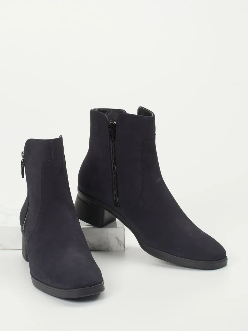 Elegant im Alltag, stilvoll im Büro.Die Marke Hartjes präsentiert mit dieser Stiefelette eine vielseitige Begleiterin für Alltag und Beruf. In dunklem Blau und aus hochwertigem Nubukleder gefertigt, das samtig angeschliffen wirkt, zeigt sich der Schuh klassisch knöchelhoch mit komfortablem Blockabsatz. Ein seitlicher Reißverschluss aus silberfarbenem Metall erleichtert das Anziehen, während die Gummisohle sicheren Halt bietet. Die schlichte Silhouette begeistert trendbewusste Trägerinnen, die Wert auf minimalistische Ästhetik und bequeme Passform legen. Ideal kombinierbar zu Wollmänteln oder Denim für einen ruhigen, urbanen Look. Hochwertige Verarbeitung und maximaler Komfort – typisch Hartjes.