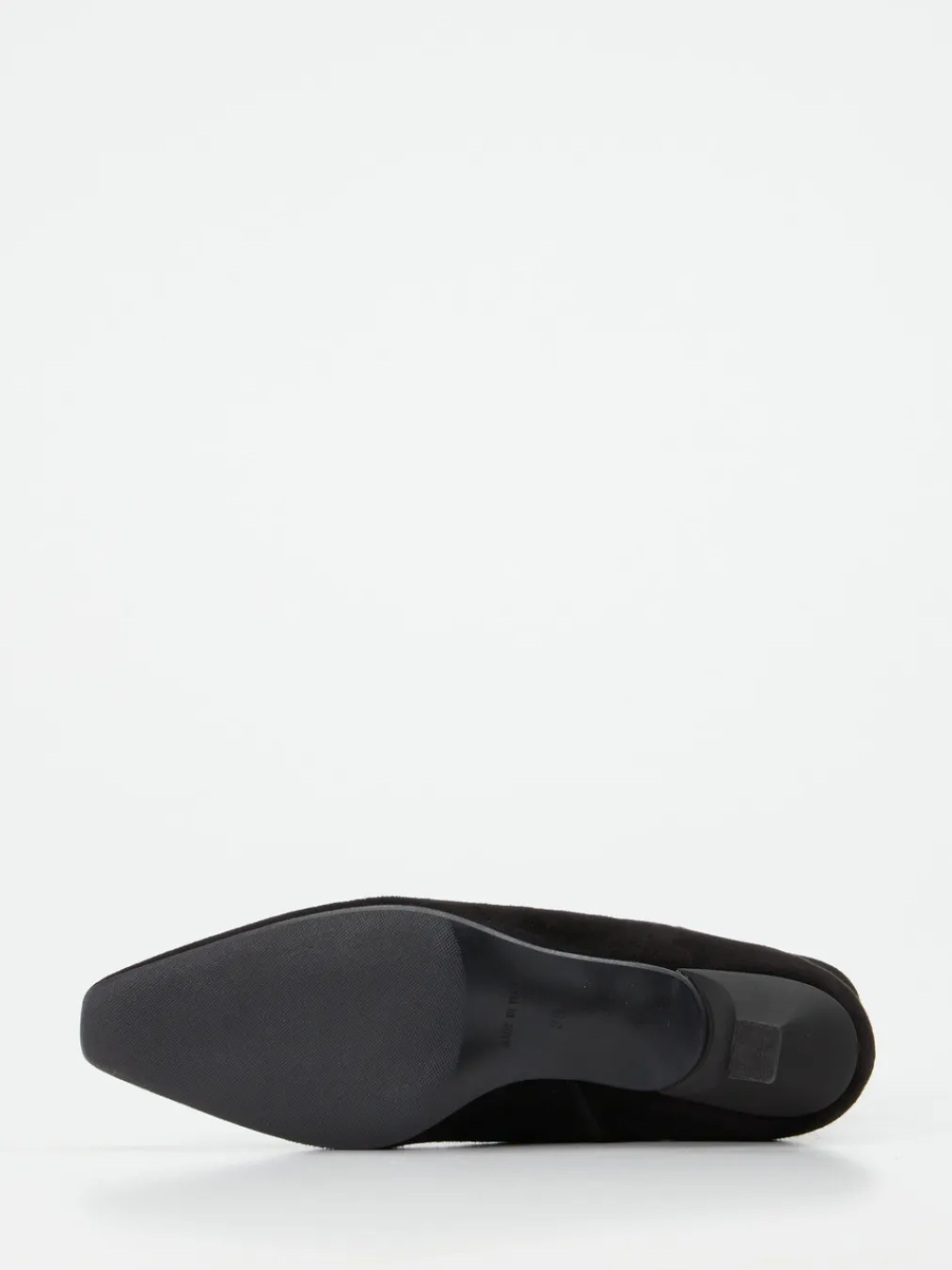 Die Kombination aus samtigem Veloursleder, spitzer Form und Kitten Heel verleiht dieser Stiefelette eine moderne Eleganz mit Retro-Note. Zarte Goldakzente setzen stilvolle Highlights.