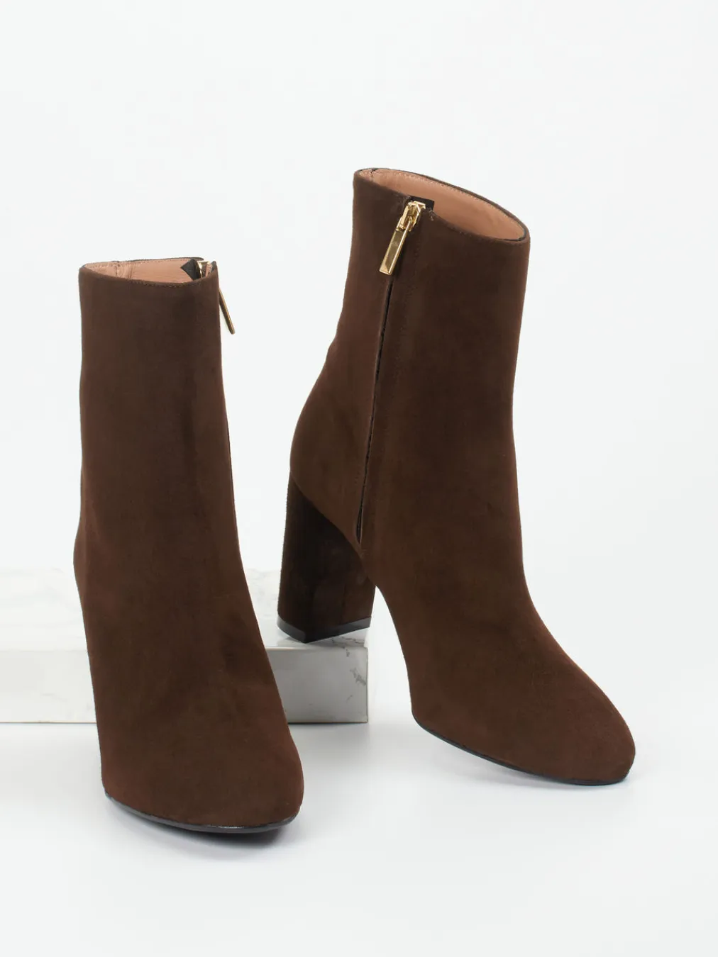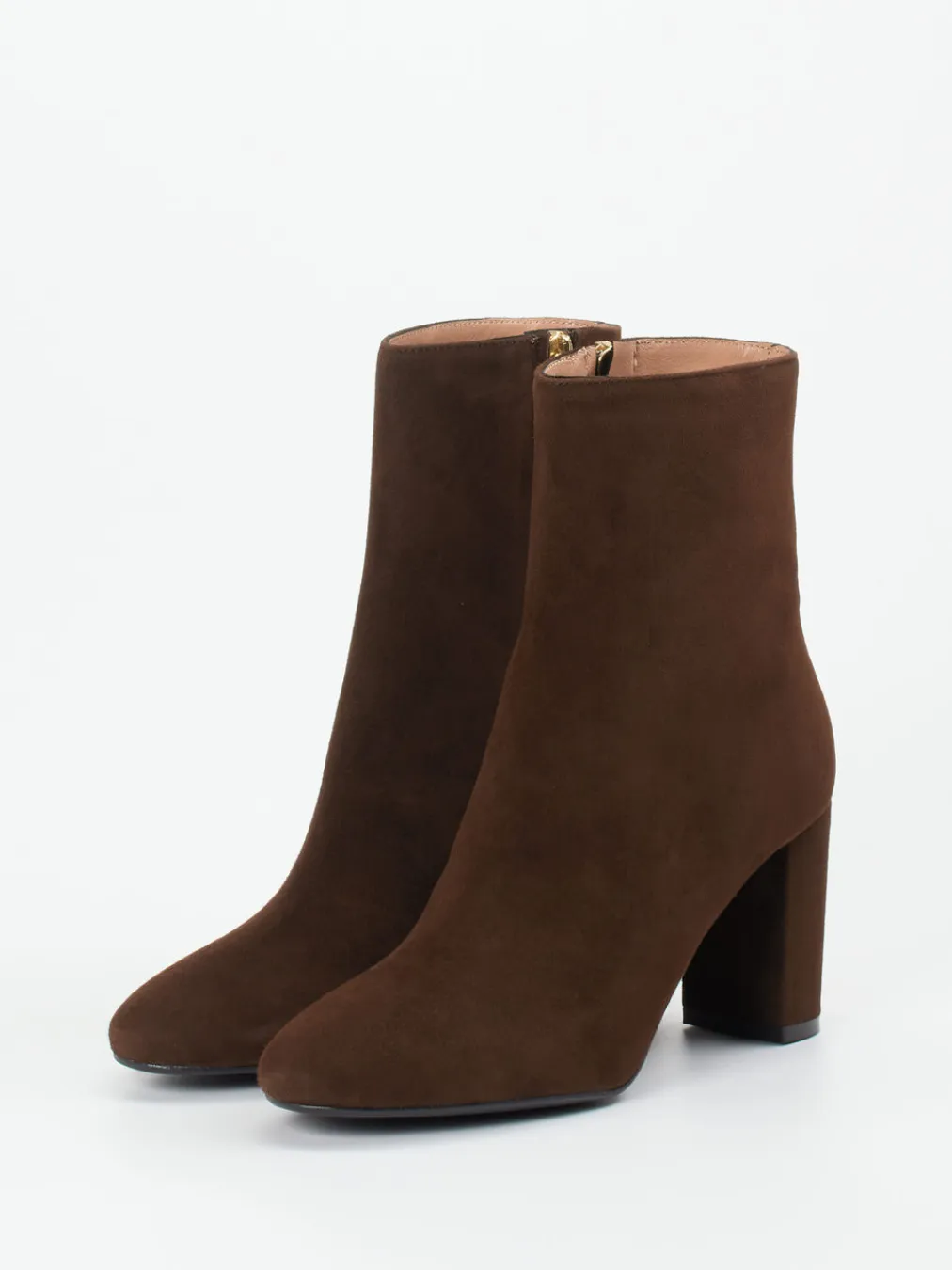 Elegantes Veloursleder in samtigem Braun trifft bei dieser Stiefelette auf eine klare, klassische Silhouette mit goldfarbenem Zipper – eine stilvolle Wahl für Büro und Alltag.