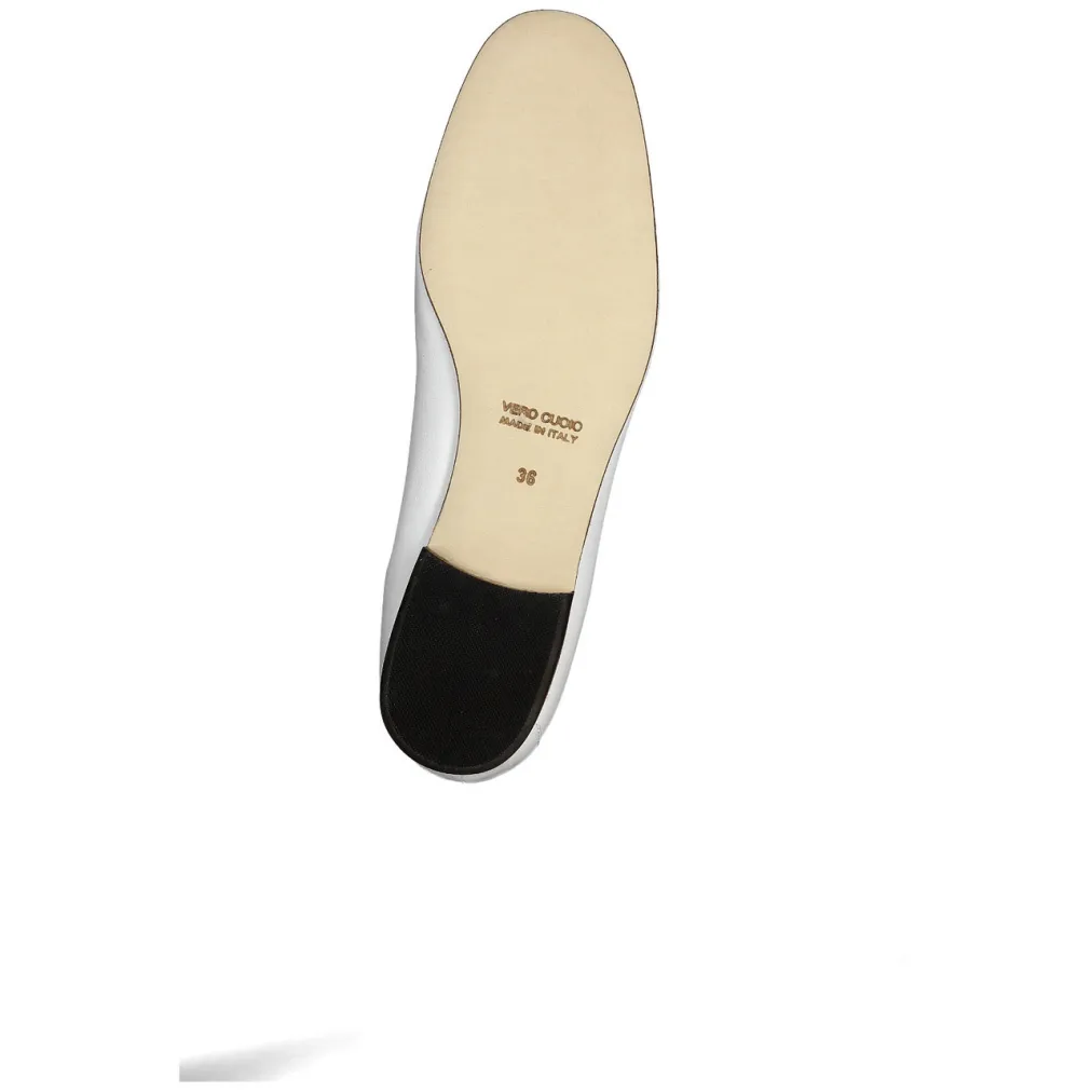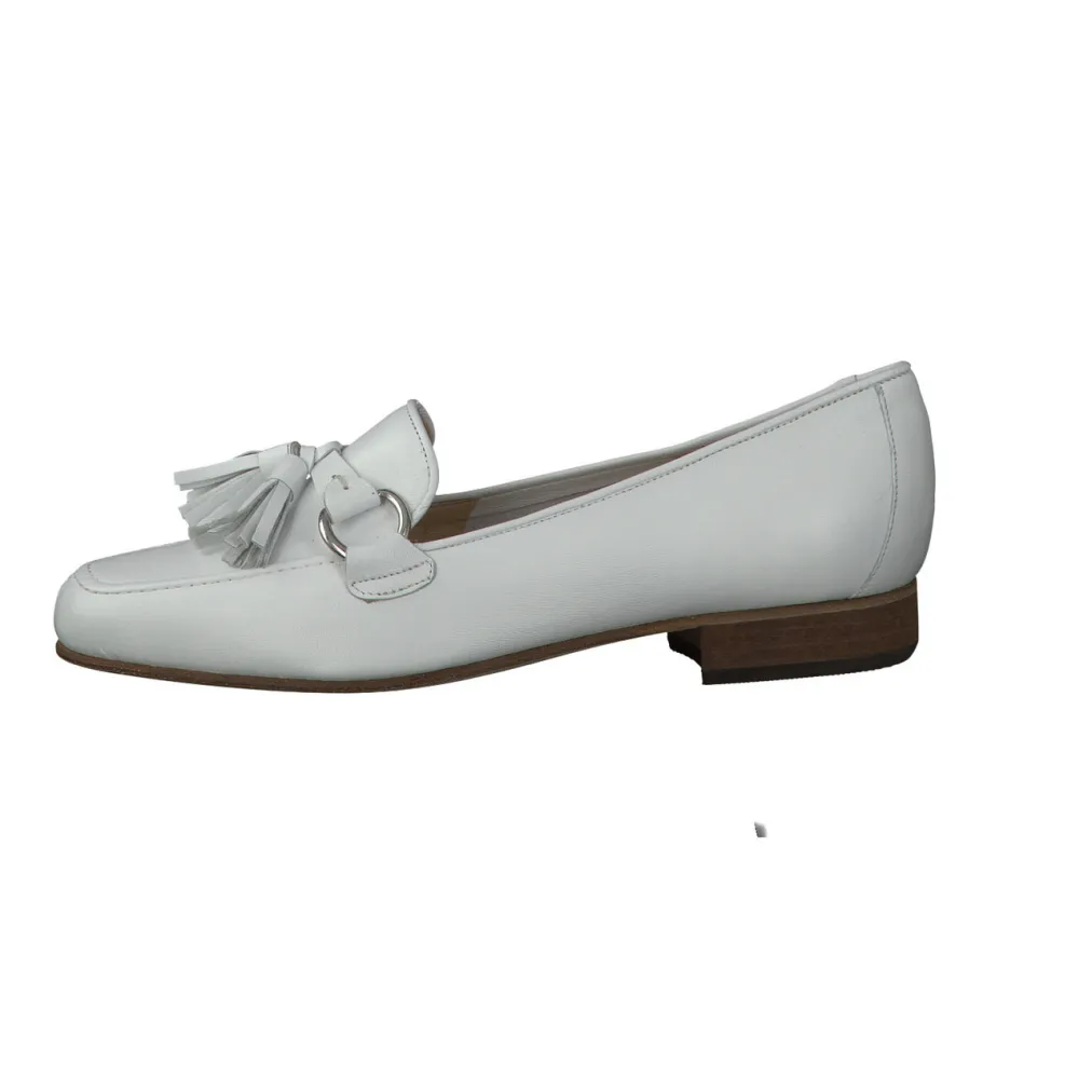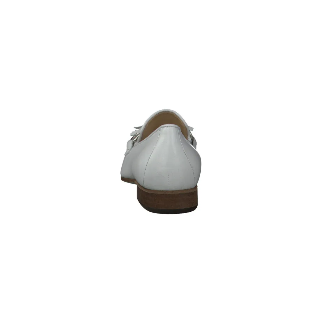 Edel sieht dieser sommerliche Slipper von Mannori aus. Das weiße Nappaleder ist samtig weich, es ist in den seitlichen Bereichen ungefüttert. Besonders attraktiv ist die handwerkliche Bride. Sie besticht durch die silberfarbenen Accessoires, den offenkantigen Riegel und die sportlichen Tasseln. Die Carréform hat eine gute Passform. Angenehm ist auch die leichte Innenpolsterung der Ledersohle. Einen farblichen Akzent setzt der dunkelnaturfarbene Ausputz des Absatzes und der Sohle.