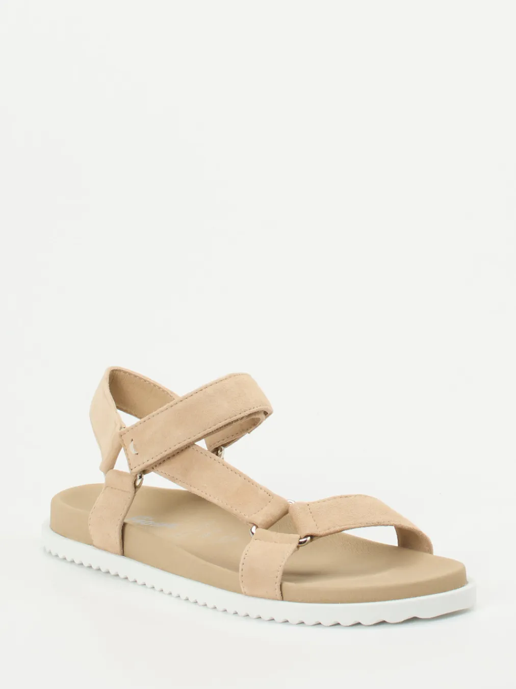 Funktionalität trifft Sommerstil.Die Marke Sioux präsentiert mit dieser Damen-Sandale ein bequemes Modell für Alltag und Urlaub. Ein idealer Begleiter für warme Tage und längere Strecken: Das sandfarbene Veloursleder ist samtig-matt verarbeitet und wirkt mit den silberfarbenen Metallringen angenehm minimalistisch. Die verstellbaren Klettverschlüsse sorgen für einen passgenauen Sitz, während die leichte Synthetiksohle mit Rillenprofil sicheren Halt bietet. Die flache, offene Silhouette unterstreicht den funktionalen Charakter – perfekt abgestimmt auf den Soft-Neutrals-Trend der Saison. Kombinierbar mit Leinen oder Naturtönen. Ein Komfortschuh mit klarer Linienführung und verlässlicher Funktion im Gorpcore-Stil.
