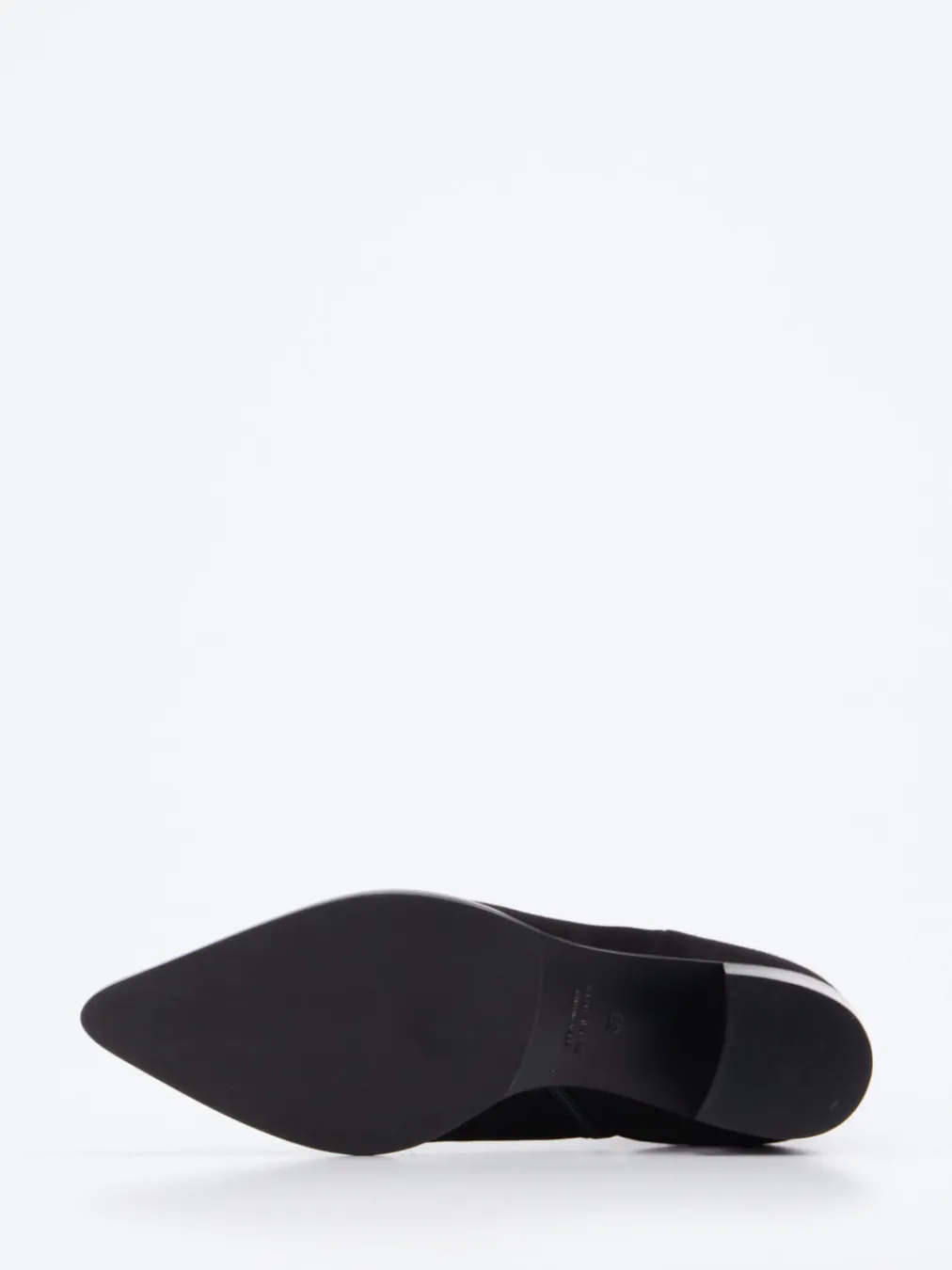 Puristische Eleganz mit hochwertigem Finish: Diese Ankle Boots aus schwarzem Veloursleder kombinieren zeitlose Formgebung mit dezenter Modernität.