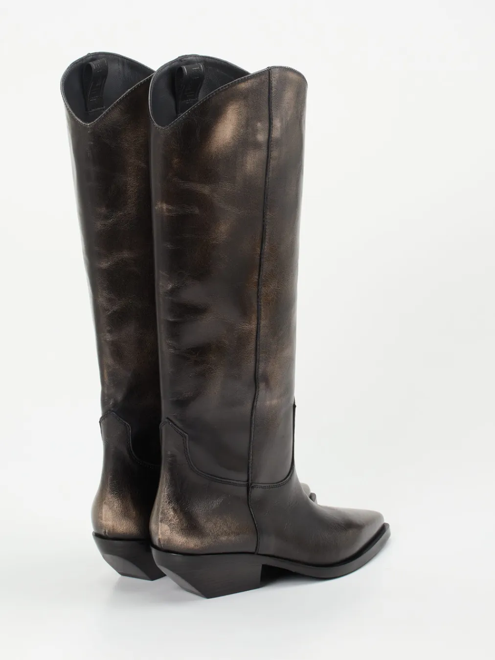 Stilvoller Western-Look trifft auf edles Metallicleder mit bronzefarbenem Schimmer – ein Statement-Stiefel für trendorientierte Looks mit Klasse.