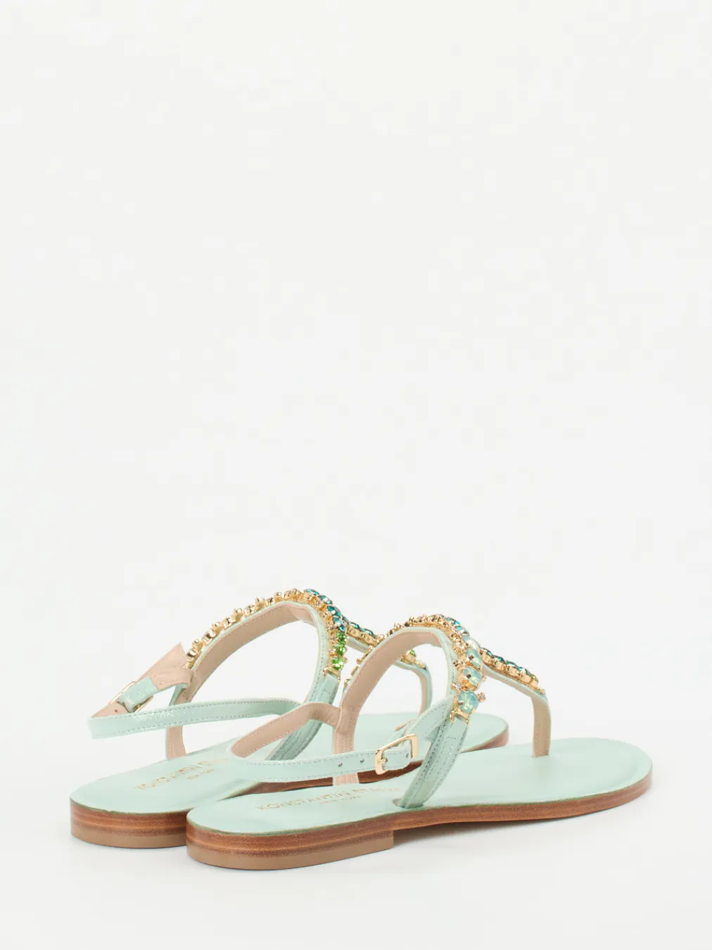 Für stilvolle Sommertage gedacht.Konstantin Starke präsentiert mit dieser Zehentrenner-Sandale ein feminines Modell für die warme Jahreszeit. Ideal für sonnige Strandspaziergänge oder entspannte Ausflüge in der Stadt: Das feine Metallicleder in zartem Mintgrün zeigt eine glänzende Oberfläche und schmiegt sich elegant um den Fuß. Raffiniert inszeniert wird das schmale Riemendesign durch funkelnde Strasssteine im grünen Farbverlauf. Die goldene Dornschließe am verstellbaren Fersenriemen ergänzt das Open-Toe-Design stimmig. Die flache Ledersohle mit Polsterung sorgt für Tragekomfort, während der Look stark von aktuellen Pastell- und Resorttrends inspiriert ist. Ein sommerlicher Statement-Schuh mit handwerklichem Anspruch und raffinierter Farbgebung.