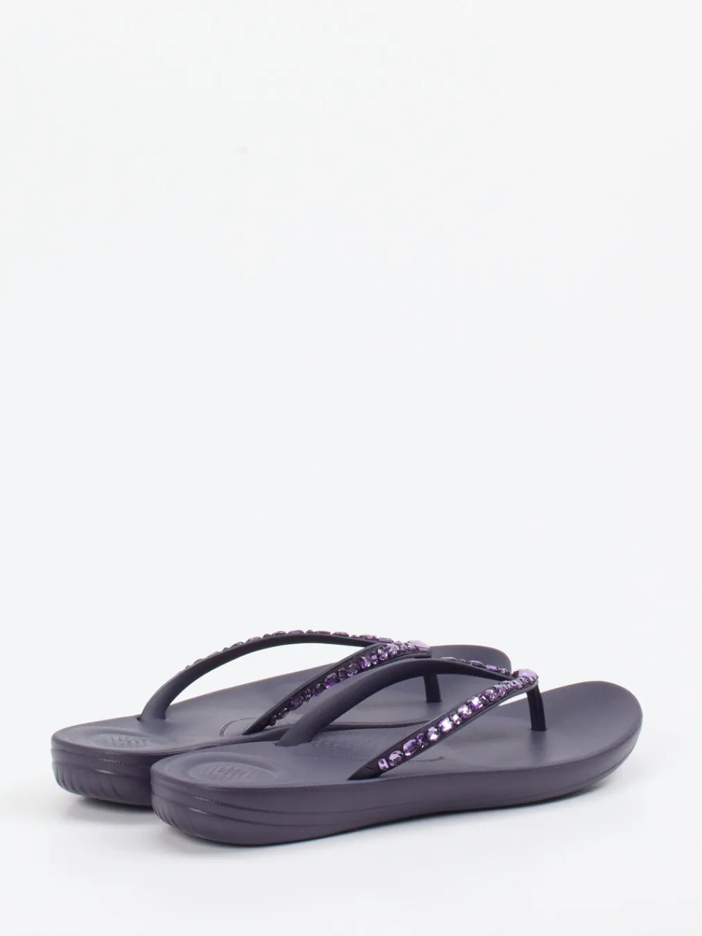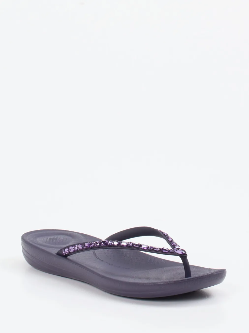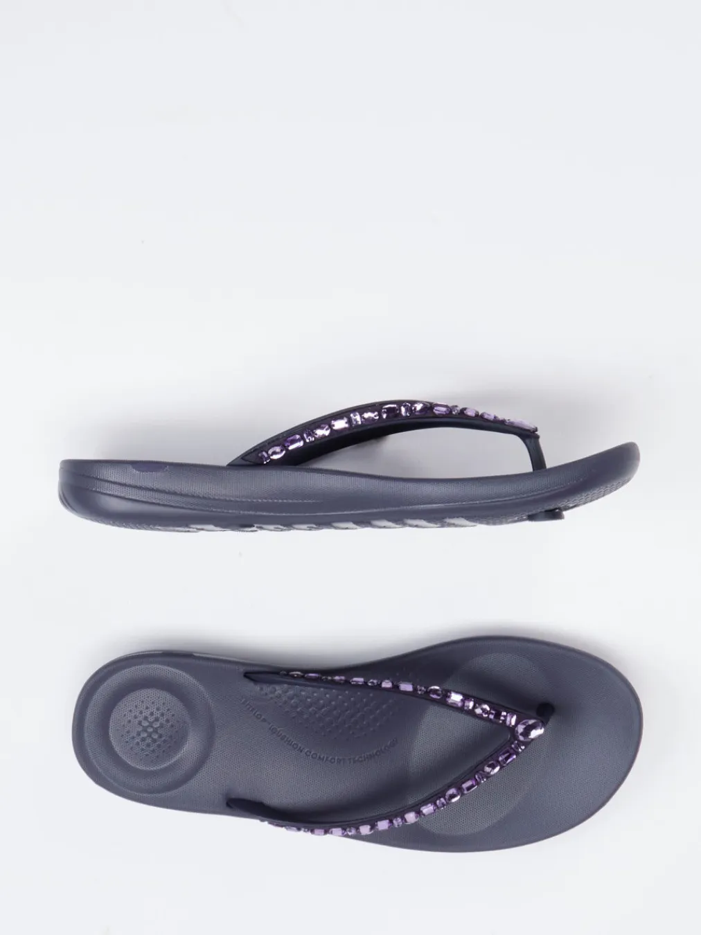 Dieser FitFlop Zehentrenner vereint ergonomischen Komfort mit funkelnden Strassdetails – ein idealer Begleiter für warme Tage mit modischem Anspruch.