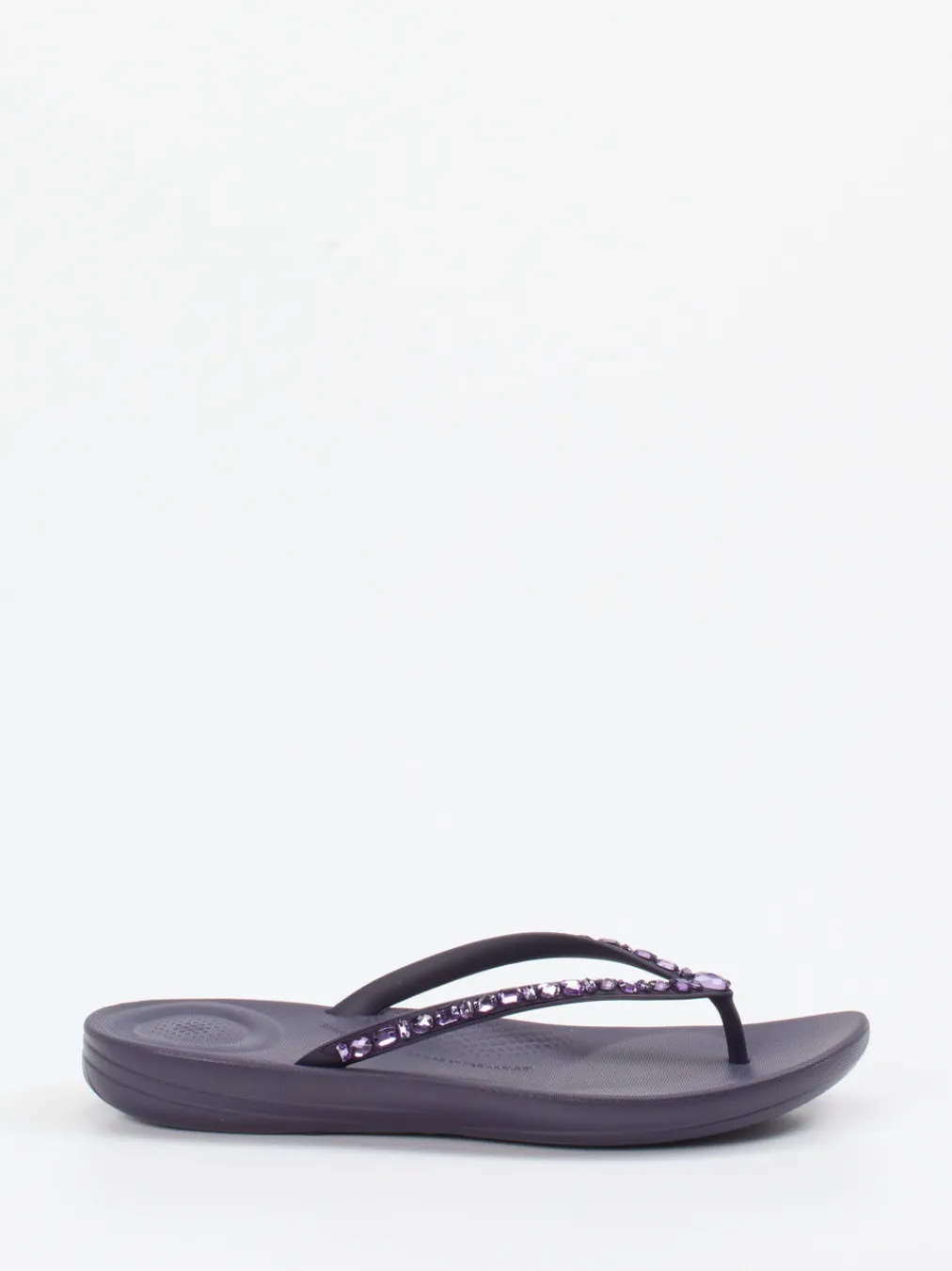 Komfort trifft Glamour.FitFlop präsentiert mit diesem Damen-Zehentrenner ein bequemes Modell für sonnige Tage. Ideal für Urlaub und Alltag bietet dieser komfortorientierte Zehentrenner mit flacher Silhouette und ergonomischer Gummisohle Entlastung für die Füße. Das synthetische Material erhält durch eine matte Oberfläche und glänzende Strasssteine am Riemen einen eleganten Akzent. Die Farbgebung in Dunkelviolett mit Amethystnuancen liegt optisch voll im Y2K-Trend und harmoniert mit minimalistischem Sommer-Outfits. Kombiniert mit Kaftan oder Strandtasche entsteht ein femininer Look mit modischer Leichtigkeit. FitFlop steht für durchdachtes Design mit Wohlfühleffekt – ideal für trendbewusste Komfortliebhaberinnen.