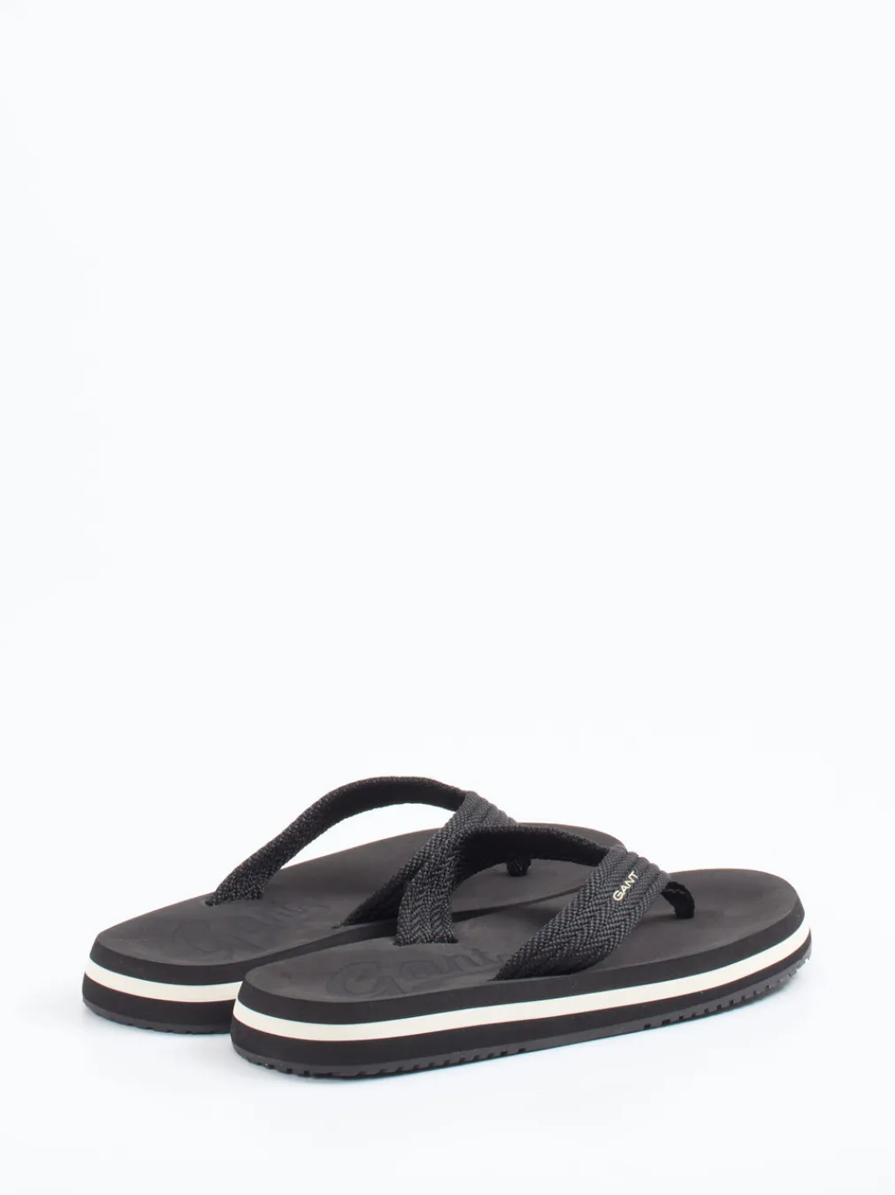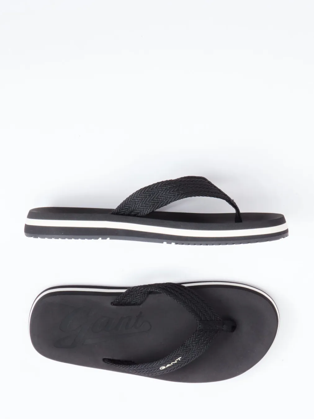 Sommerlaune satt: cleanes Design mit Kontrastakzent. Die Herren-Zehentrenner von Gant überzeugen mit einem gewebten Textilriemen und einer schwarzen EVA-Sohle. Ideal für entspannte Freizeitmomente: Die flache Silhouette, die rutschfeste, profilierte Gummilaufsohle und der weiße Kontraststreifen in der Zwischensohle sorgen für Komfort und visuelle Leichtigkeit. Eine dezente Logo-Prägung auf der Innensohle und am Riemen unterstreicht den puristischen Stil. Perfekt in Kombination mit Badeshorts oder Chinos bei sommerlichen Temperaturen. Maximal lässig, minimal im Auftritt – Gant setzt auf entspannte Klarheit.