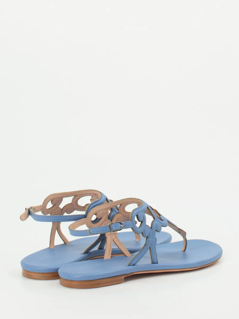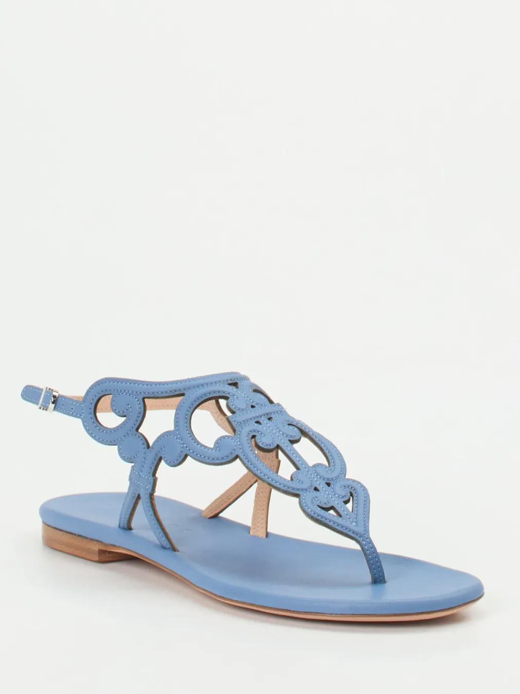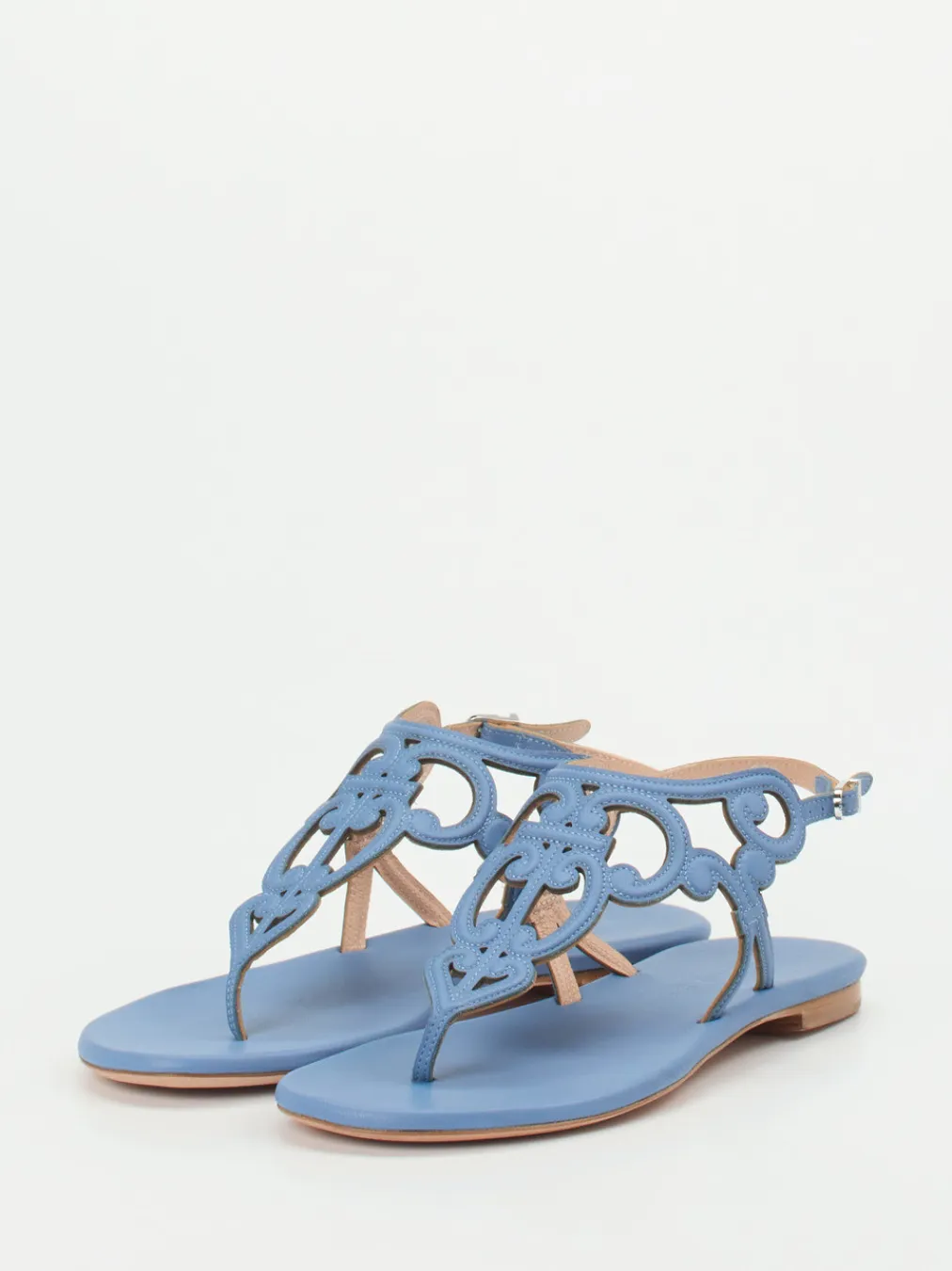 Sommerleicht und stilbewusst.Unützer kreiert mit dieser Zehentrenner-Sandale ein feines Damenmodell für warme Tage. Für Spaziergänge durch die Stadt oder entspannte Stunden am Meer: Das weiche, taubenblaue Kalbleder ist samtig matt und mit kunstvoller Cut-Out-Musterung versehen. Der feminine Fersenriemen mit silberfarbener Dornschließe unterstreicht das minimalistische Design und sorgt für optimalen Halt. Die hochwertige Ledersohle betont das edle Gesamtbild und gibt sich modebewusst im Einklang mit den Pastelltrends der Saison. Der flache Aufbau wirkt dabei angenehm zurückhaltend. Ein souveräner Sommerschuh mit italienischer Lederhandwerkskunst und besonderem Feinschliff.