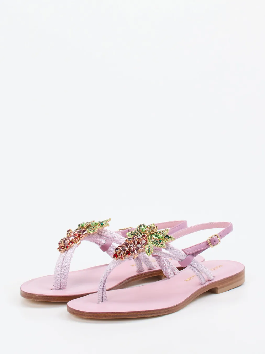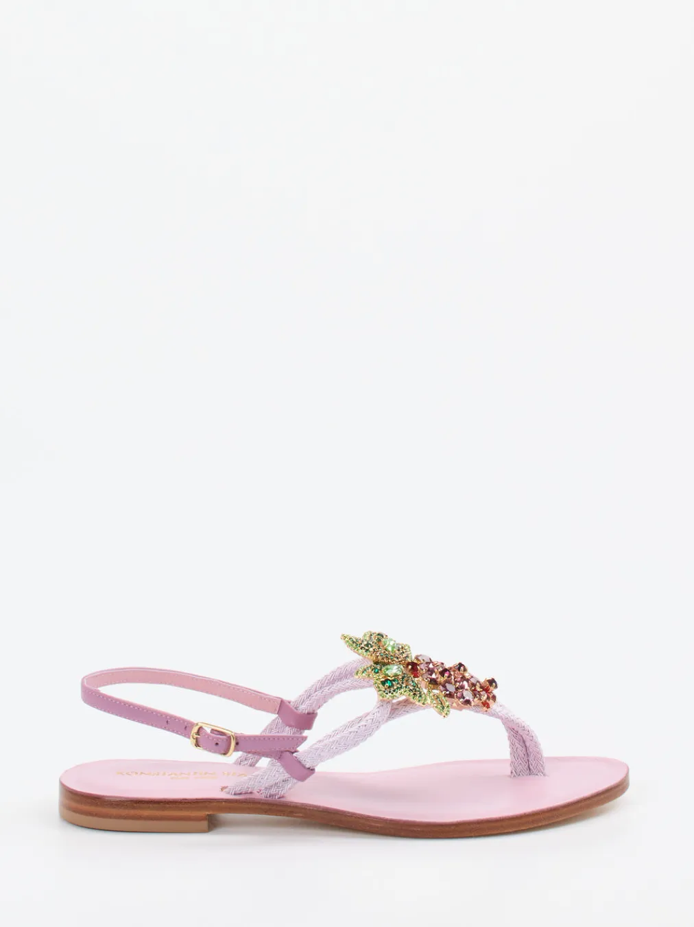 Die Kombination aus geflochtenem Textilriemen, zartem Fliederleder und floraler Kristallverzierung verleiht dieser Sandale stilvolle Raffinesse und sommerliche Leichtigkeit.