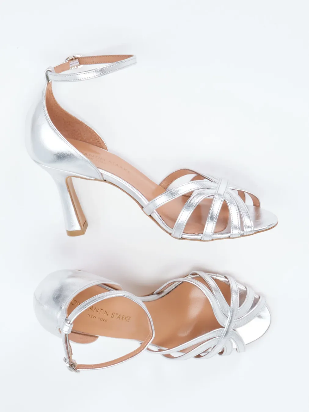 Glamouröser Auftritt in Silberschimmer.Die Damen-Abendsandale von Konstantin Starke verbindet elegantes Design mit hochwertigen Materialien. Für festliche Abende oder besondere Events bietet das silberfarbene Metallicleder mit dezenter Narbung eine stilvolle und moderne Grundlage. Die glänzende Oberfläche sowie feine, mehrfach überkreuzte Riemen unterstreichen den femininen Charakter. Ein verstellbarer Fesselriemen mit silberfarbener Schnalle sorgt für sicheren Halt. Die offene Silhouette und der ca. 8 cm hohe, lederbezogene Absatz betonen die grazile Linienführung. Stilistisch bewegt sich das Modell zwischen 90s-Vintage-Chic und Y2K-Revival – ideal für trendaffine Looks. Edles Design trifft auf handwerkliche Qualität von Konstantin Starke.
