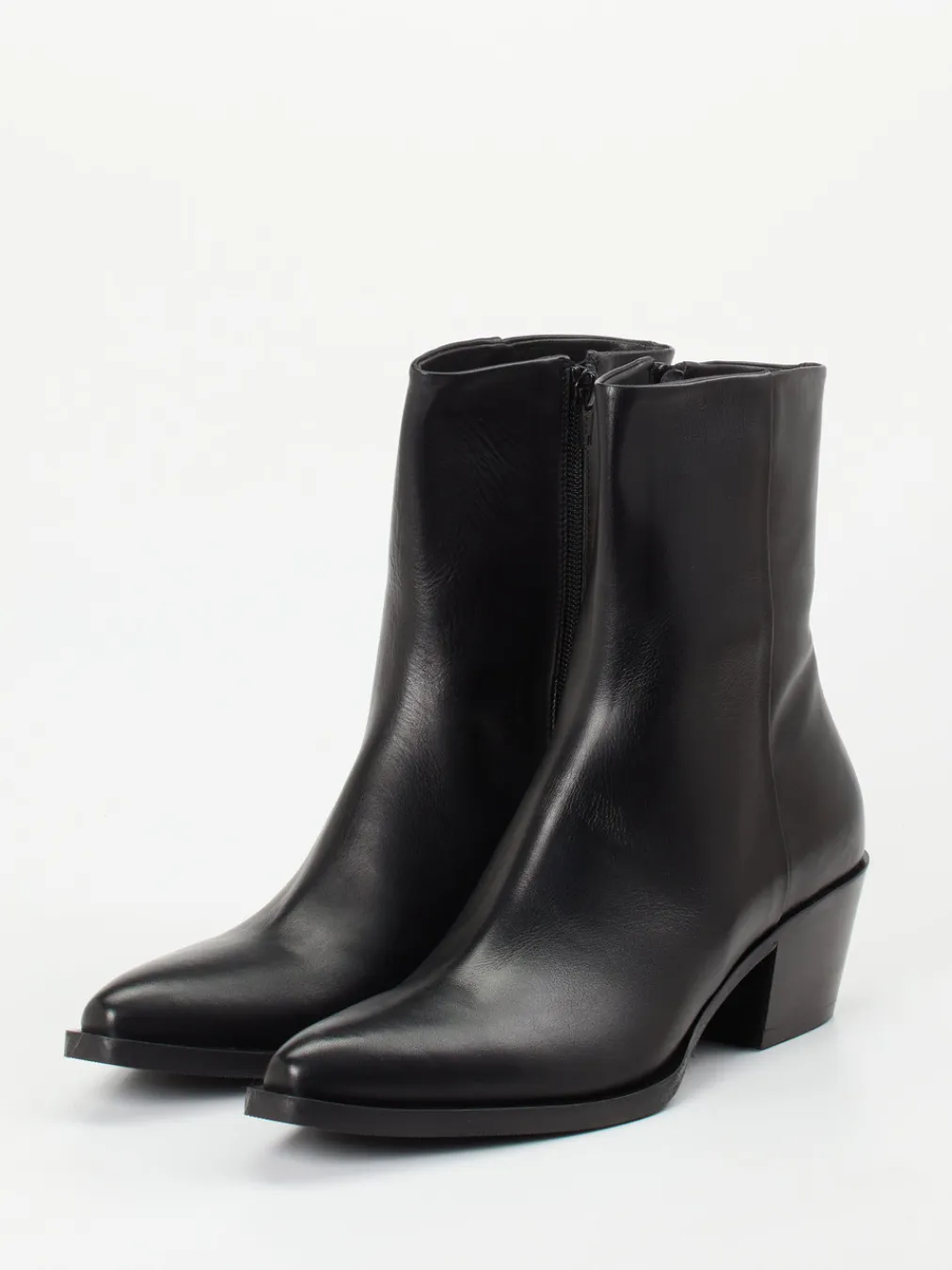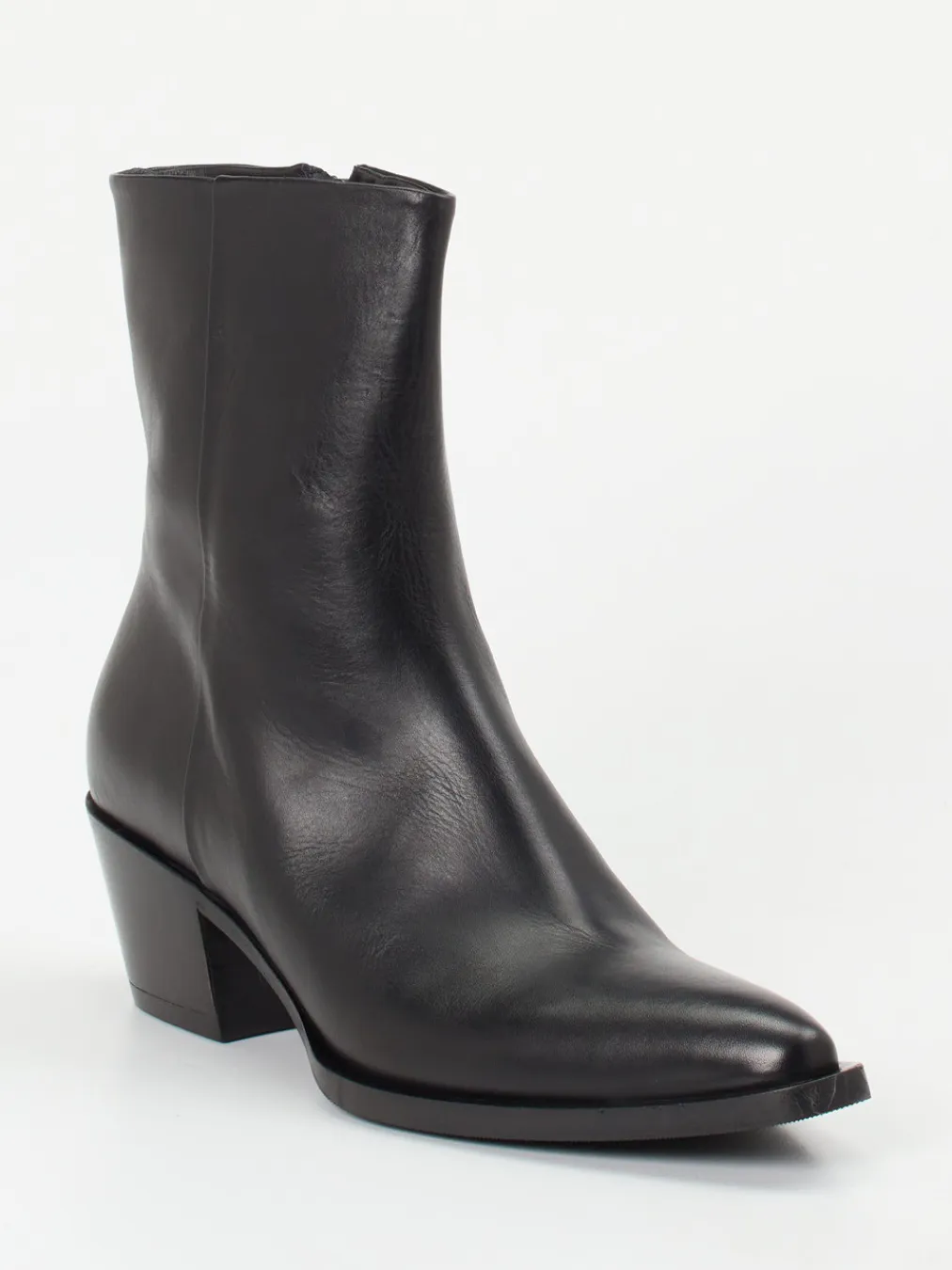 Ein edler Ankle Boot aus schwarzem Kalbleder, der mit spitz zulaufender Form und stabilem Blockabsatz modernen Minimalismus versprüht.
