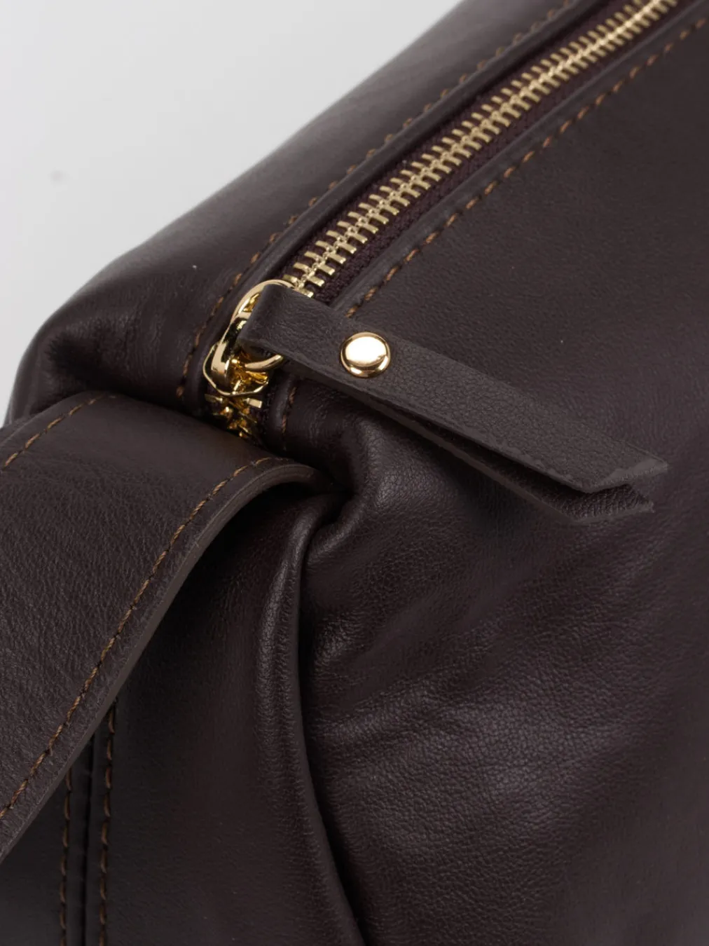 Diese dunkelbraune Schultertasche vereint minimalistisches Design mit edlem Lammleder – ein stilvoller Begleiter für Büro und Alltag.