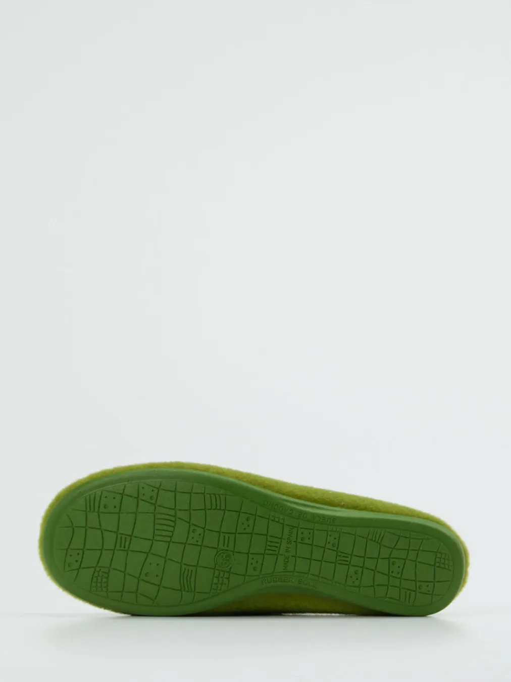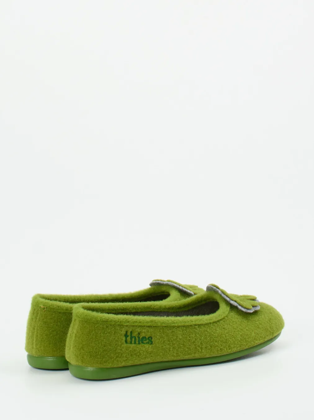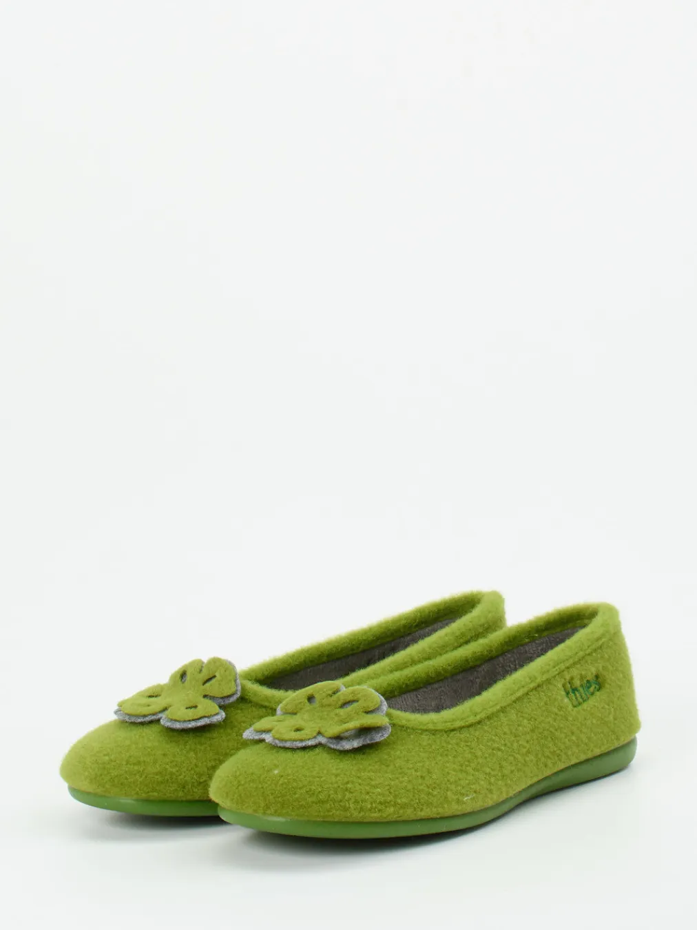 Gemütlichkeit in ihrer schönsten Form.Thies präsentiert einen komfortorientierten Ballerina-Hausschuh für Damen aus nachhaltigem Wollfilz. An kühlen Tagen bietet das Modell wohlig warme Entspannung im Innenbereich. Der apfelgrüne Filz strahlt Frische und Natürlichkeit aus und wird durch eine zweilagige Blütenapplikation in Grau akzentuiert. Die klassische, rund gearbeitete Form wird durch eine rutschhemmende Gummisohle ergänzt. Der Einstieg in Schlupfform betont die unkomplizierte Nutzung. Inspirieren lässt sich das Design von minimalistischen und loungetauglichen Trends wie Cottagecore. Ein Hausschuh für stilbewusste Ruhepole mit Fokus auf Komfort und dezente Verspieltheit.