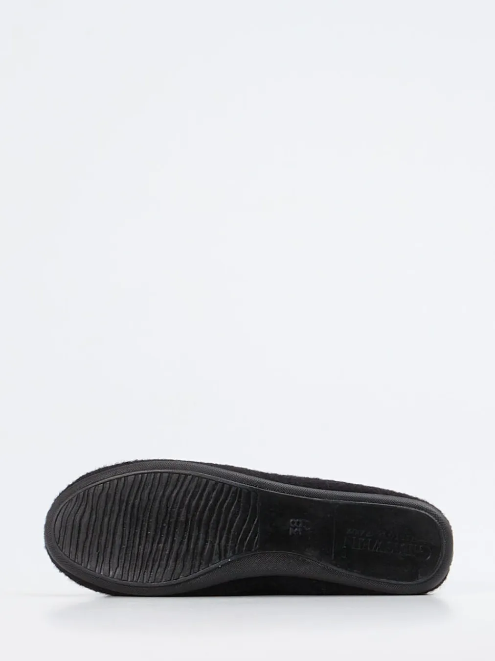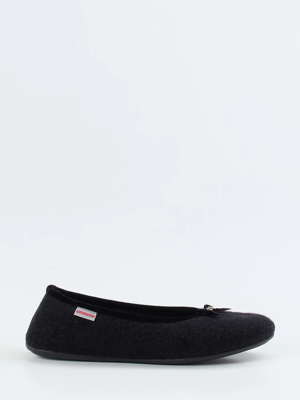 Komfort trifft auf leises Stilbewusstsein.Giesswein präsentiert einen femininen Hausschuh im klassischen Ballerina-Stil für Damen. Ideal für ruhige Momente zu Hause, kombiniert dieses Modell wärmenden Wollfilz mit einer samtig-filzigen Oberfläche in tiefem Schwarz. Der rund geformte Einstieg ist mit einem edlen Veloursband eingefasst, während eine zarte Zierschleife mit Strassdekor dem Design eine elegante Note verleiht. Die rutschfeste Gummisohle garantiert sicheren Halt auf glatten Böden. Als ruhiger Begleiter zu Loungewear unterstreicht dieser Hausschuh den „Quiet Luxury“-Trend der Saison. Ein stilbewusster Wohlfühlschuh mit funktionalem Anspruch – typisch Giesswein.