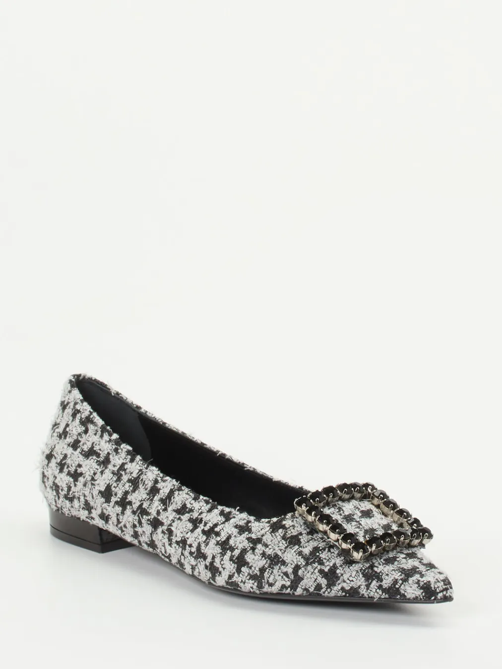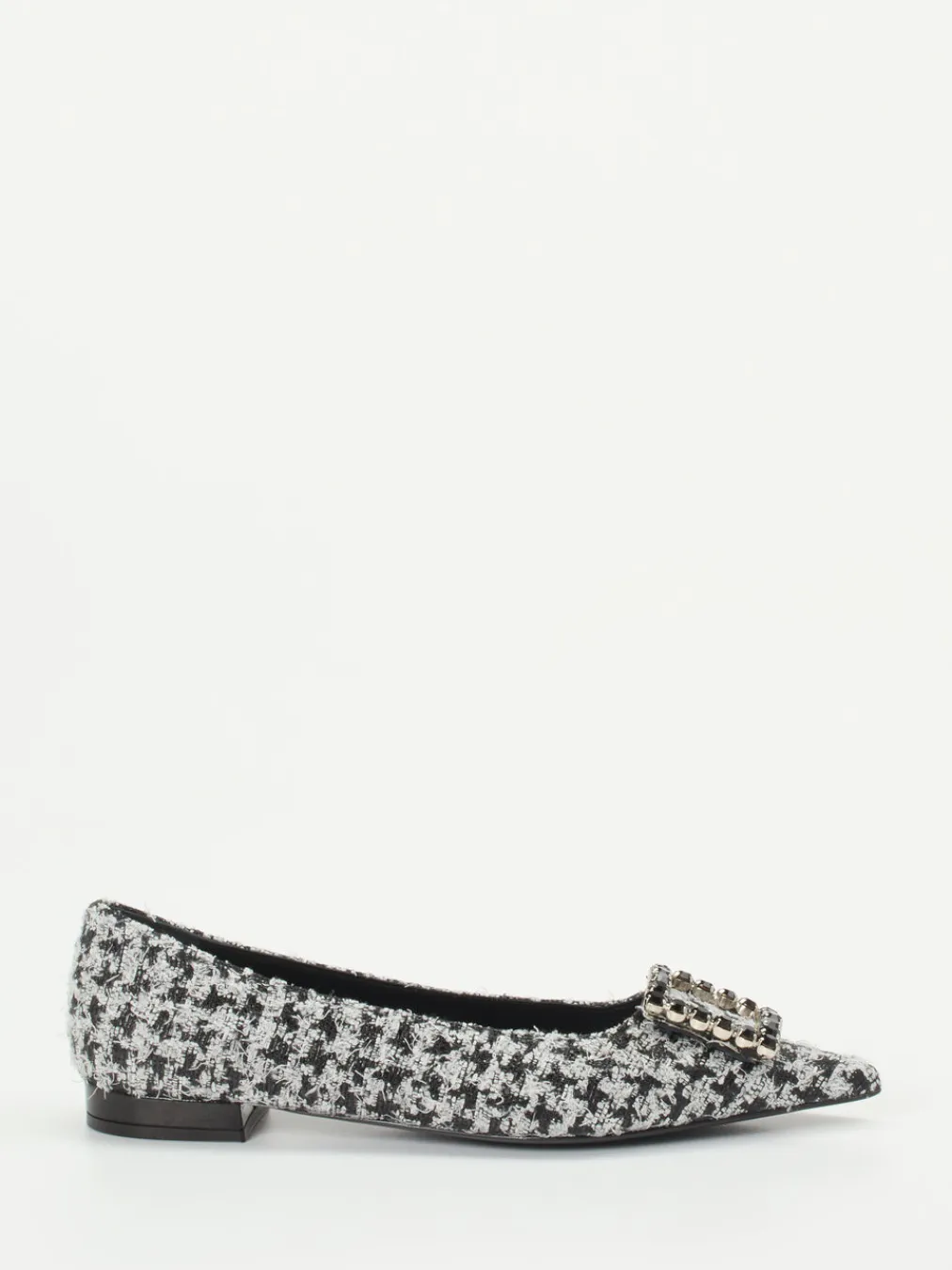 Diese spitz zulaufenden Bouclé-Ballerinas verbinden klassisches Hahnentrittdesign mit einer edlen Schmuckschließe – ein dezentes Highlight im Business- oder Anlassoutfit.