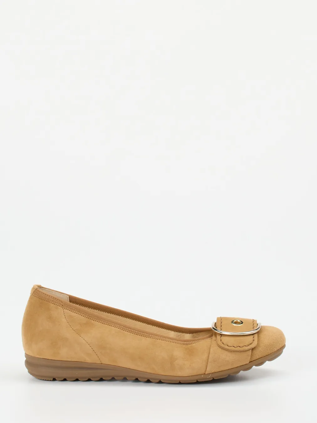 Stilvoller Komfort für jeden Tag.Gabor Comfort präsentiert bequeme Damen-Ballerinas mit softer Linienführung und durchdachter Ausstattung. Ideal für Büro und Freizeit: Das camalfarbene Veloursleder mit matter Oberfläche liegt angenehm am Fuß. Der klassische Rundschnitt und die flache Schlupfform sorgen gemeinsam mit der komfortablen G-Weite für ein entspanntes Tragegefühl. Blickfang auf dem Blatt ist eine große, silberfarbene Schnalle mit goldfarbenen Ösen. Eine gepolsterte Innensohle und die profilierte Gummisohle bieten Trittsicherheit auf allen Wegen. Modisch im Geist des Quiet Luxury-Trends, lassen sie sich vielseitig kombinieren – besonders harmonisch zu sanften Naturtönen. Ein eleganter Komfortschuh mit dezenter Raffinesse – typisch Gabor Comfort.