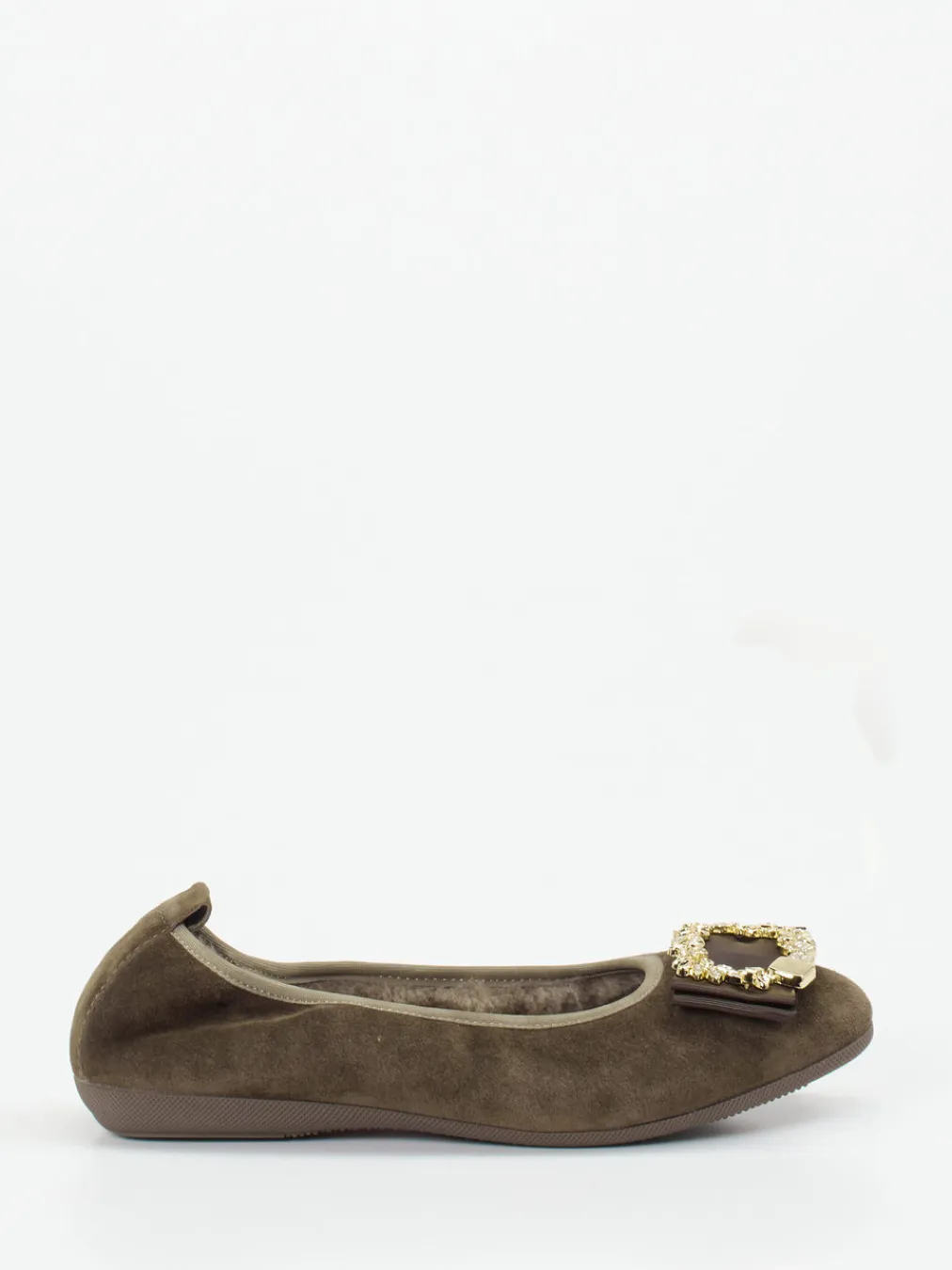 Wärmender Chic mit femininer Raffinesse.La Ballerina interpretiert klassische Damen-Ballerinas saisonal neu. Dieses Modell bietet komfortable Eleganz für kühlere Tage. Das feinsamtige Veloursleder zeigt sich in edlem Olivbraun mit matter Oberfläche und präzisem Finish. Im Inneren sorgt echtes Lammfell für wohlige Wärme – perfekt für Freizeit wie festliche Gelegenheiten. Die runde Form, das elastische Ripsband und die flexible Gummisohle garantieren optimalen Sitz und Tragekomfort. Besonderes Highlight: eine austauschbare Schmuckspange in floraler Goldoptik mit Strass-Besatz. Die Retro-Feminin-Ästhetik mit „Quiet Luxury“-Appeal passt zu Strick und Wildledertaschen. Ein stilvolles Statement für kalte Tage mit signifikantem Tragekomfort.