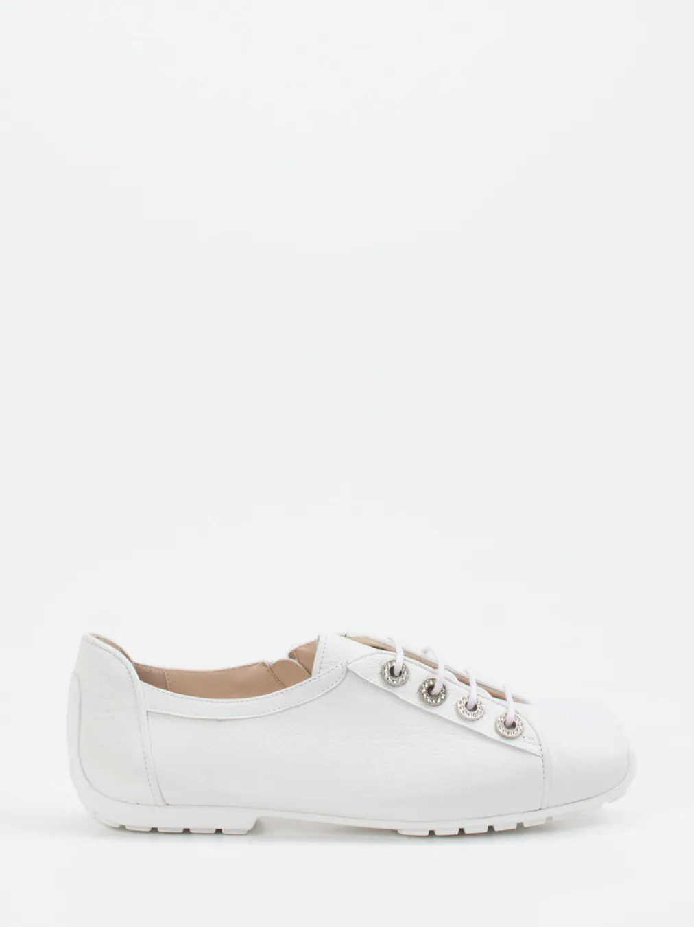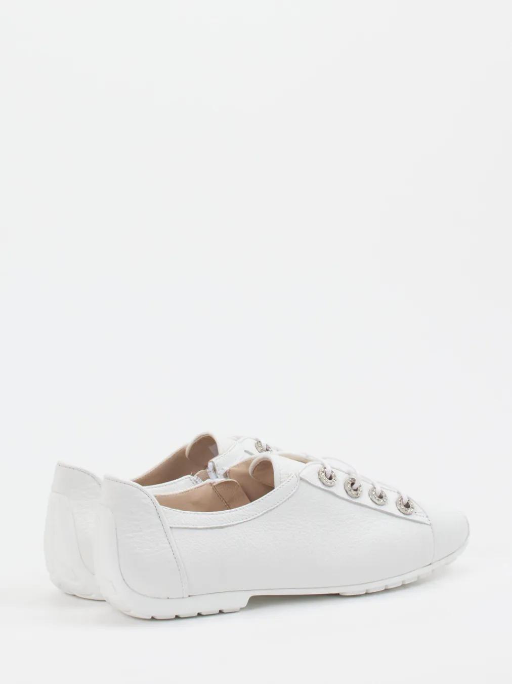 Das weiße, genarbte Lammleder verleiht dem Sneaker eine geschmeidige Haptik mit dezentem Glanz, während silberfarbene Ösen mit funkelnden Swarovski Kristallen edle Akzente setzen. Die flache, runde Form und eine flexible Gummisohle mit hochgezogener Ferse sorgen für Komfort bei täglichen Erledigungen oder entspanntem Flanieren. Schnürung und seitlicher Reißverschluss erleichtern das An- und Ausziehen. Inspiriert vom Trend „Quiet Luxury“ fügt sich das Modell harmonisch in minimalistische Looks.